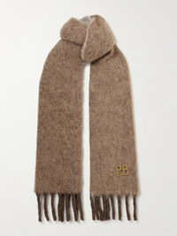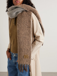 Ruslan Baginskiy's scarf feels fluffy and springy - there are hints of alpaca and mohair in the blend, and they lend a beautiful texture. It's knitted with fringed ends and appliqued with the Ukrainian designer's monogram.