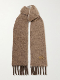 Ruslan Baginskiy's scarf feels fluffy and springy – there are hints of alpaca and mohair in the blend, and they lend a beautiful texture. It's knitted with fringed ends and appliqued with the Ukrainian designer's monogram. Details & Care - Tonal-beige wool, nylon, alpaca and mohair-blend - 42% wool, 30% nylon, 14% alpaca, 14% mohair - Dry clean