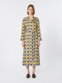DETAILS Long caftan-style dress with belt to highlight the silhouette. Printed pure silk twill dress Straight cut Small lapel collar Set-in sleeves with shirt cuffs and slit at the hem Concealed front fastening Side inset pockets Unlined COMPOSITION AND CARE 100% silk. Do not wash; do not bleach; do not tumble dry; cool iron; professionally dry clean perchloroethylene - mild process; do not wet clean.; wash the garment while it is fastened.; contains non-textile parts of animal origin. Distributed by Max Mara S.r.l., registered office in Reggio Emilia (Italy), Via Giulia Maramotti 4, 42124 (IT)