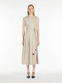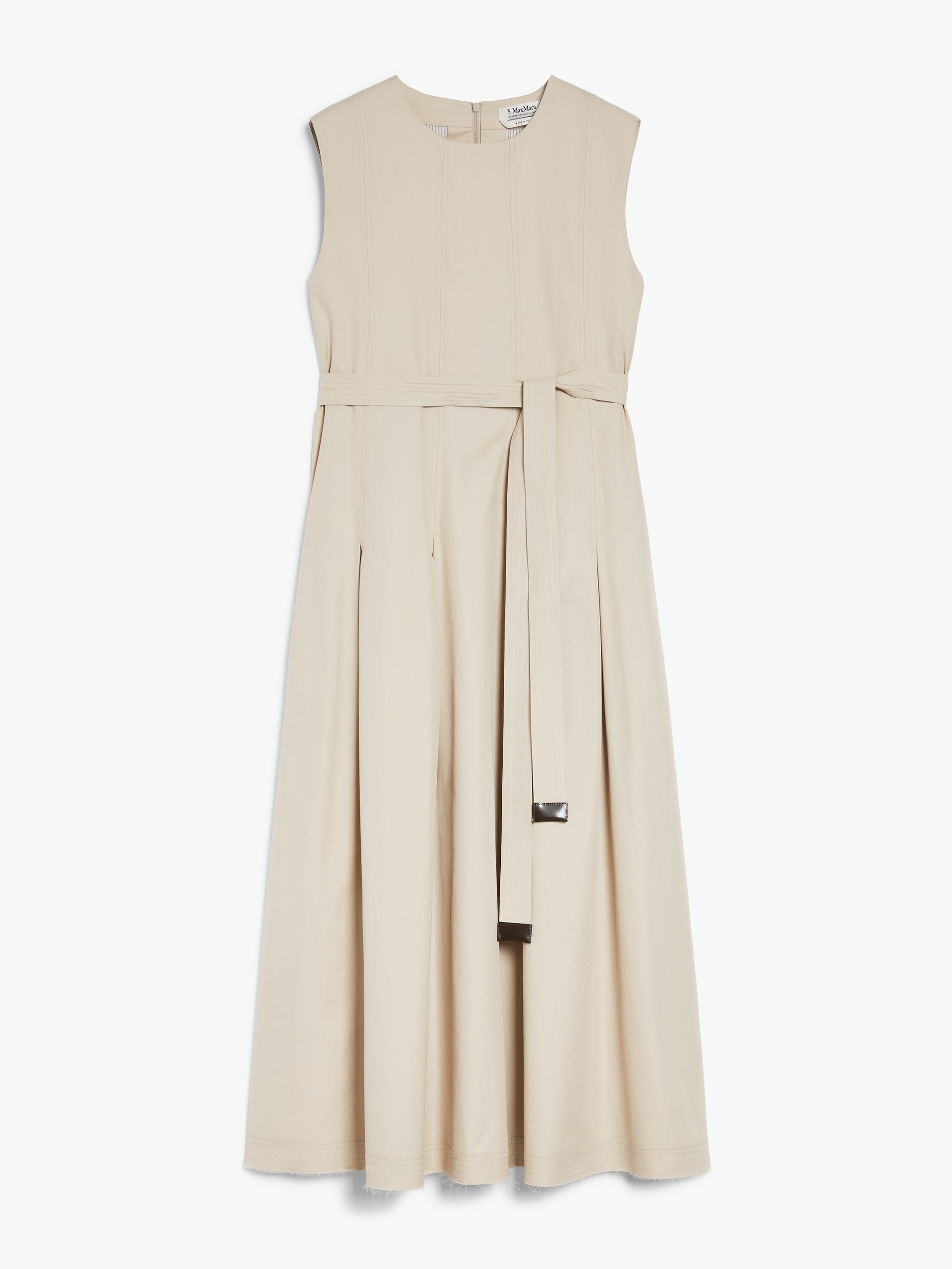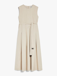 DETAILS Sleeveless dress in washed pure-cotton twill, featuring a pleated pattern at the centre, front and back that accentuates the silhouette and gives the garment volume. Finished with stitching at the hem, inset side pockets, and a matching belt to accentuate the waist. Invisible zip fastening on the back. COMPOSITION AND CARE Fabric 100% cotton; lining 92% cotton, 8% polyamide. Machine wash cold delicate cycle; do not bleach; do not tumble dry; line drying in the shade; cool iron; professionally dry clean perchloroethylene - mild process.; remove the belt before washing.; contains non-textile parts of animal origin. Distributed by Max Mara S.r.l., registered office in Reggio Emilia (Italy), Via Giulia Maramotti 4, 42124 (IT)