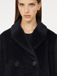 DETAILS Double-breasted jacket with an extremely soft and fluffy texture. Jacket in wool and alpaca fabric Straight fit Lapel collar and long set-in sleeves Horn button fastening Side-inset pockets with a front flap Central rear slit Lined model COMPOSITION AND CARE Fabric 62% alpaca, 38% virgin wool; lining 69% acetate, 31% cupro. Do not wash; do not bleach; do not tumble dry; cool iron; professionally dry clean perchloroethylene - mild process; do not wet clean.; wash the garment while it is fastened.; do not iron the buttons.; protect buttons before washing.; turn the articles inside out before washing.; contains non-textile parts of animal origin. Distributed by Max Mara S.r.l., registered office in Reggio Emilia (Italy), Via Giulia Maramotti 4, 42124 (IT)