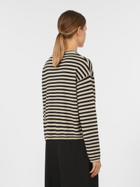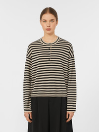 DETAILS Grandad jumper, slightly cropped to the waist. Striped wool yarn jumper Boxy fit Crew neckline, closed with buttons Long sleeves with dropped shoulders Ribbed edges COMPOSITION AND CARE 100% wool. Hand wash cold (40°c max); do not bleach; do not tumble dry; flat drying in the shade; cool iron; professionally dry clean perchloroethylene - mild process; do not wet clean.; iron with a cloth between.; using neutral detergent.; turn the articles inside out before washing.; to be ironed on reverse. Distributed by Max Mara S.r.l., registered office in Reggio Emilia (Italy), Via Giulia Maramotti 4, 42124 (IT)