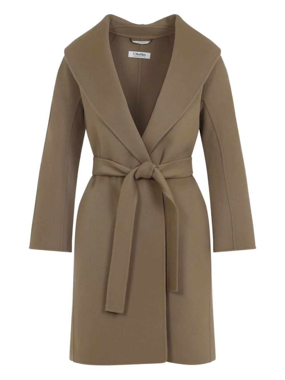belted wrap coat Highlights - Camel - Wrap fastening - Shawl collar - Self-tie belt - Long sleeves - Wool Made in Italy Composition Virgin Wool 100% Washing instructions Read Manufacturer Guidelines