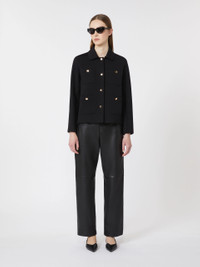 DETAILS Cropped jacket featuring four patch pockets with metallic buttons on the front. - Scuba jersey jacket - Boxy fit - Shirt collar - Long kimono sleeves - Visible gold-coloured button fastening on the front - Straight hem - Unlined model COMPOSITION AND CARE 78% cotton, 16% polyester, 6% elastane. Hand wash cold (40°c max); do not bleach; do not tumble dry; flat drying in the shade; cool iron; professionally dry clean perchloroethylene - mild process; do not wet clean.; iron with a cloth between.; using neutral detergent.; don’t rub.; turn the articles inside out before washing.; to be ironed on reverse. Distributed by Max Mara S.r.l., registered office in Reggio Emilia (Italy), Via Giulia Maramotti 4, 42124 (IT) Collection: 'S Max Mara Product code: 9911056106002 - SMMARMONIOSO