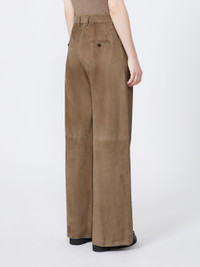 DETAILS Wide-leg trousers, finished with leather-goods seams and stitching. Lambskin suede trousers Wide leg with double pleats on the front Fastening with a wide waistband tab, zip fly and small hook Side inset pockets Welt pockets with horn button at the back Belt loops Half-lined in silk COMPOSITION AND CARE Style in lamb leather; lining 100% silk. Do not wash; do not bleach; do not tumble dry; do not iron; do not dry clean; do not wet clean.; do not wash or dry clean by fabric methods. clean only by leather and fur specialists.; do not iron the buttons.; care should be taken with light-coloured garments and accessories because body heat could lead the leather to colour loss and staining. care should be taken when sitting on light-coloured surfaces, especially if damp. avoid lengthy exposure to direct light or heat sources. do not store garments in plastic bags for long periods. Distributed by Max Mara S.r.l., registered office in Reggio Emilia (Italy), Via Giulia Maramotti 4, 42124 (IT)