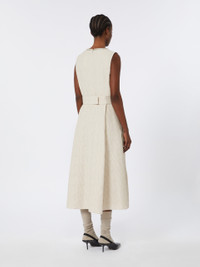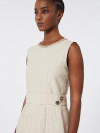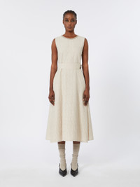 DETAILS Sleeveless midi dress with waist seam and pleating that lends volume. Jacquard-patterned cotton- and silk-blend dress A light metallic fibre makes the garment shine Flared fit Crew neck with lame fabric inlay detail Adjustable belt with buttons and removable embroidery Lined model COMPOSITION AND CARE Fabric 75% cotton, 12% silk, 9% acrylic, 4% metallised fiber; fabric 2 40% polyester, 35% cotton, 9% metallised fiber, 8% viscose, 8% acrylic; lining 100% cotton. Do not wash; do not bleach; do not tumble dry; cool iron; professionally dry clean perchloroethylene - mild process; do not wet clean.; remove the decorations before washing. Distributed by Max Mara S.r.l., registered office in Reggio Emilia (Italy), Via Giulia Maramotti 4, 42124 (IT)