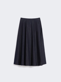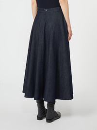 DETAILS Midi skirt with a flared silhouette finished with a contrasting tailored pick stitch. - The main fabric contains at least 50% cotton fibre, grown according to organic farming standards - Garment-washed cotton denim skirt - Regular waist - Back concealed zip fastening - Slant pockets at the sides - Lined COMPOSITION AND CARE Fabric 93% cotton, 7% kapok; lining 100% cotton. Machine wash cold delicate cycle; do not bleach; do not tumble dry; line drying in the shade; cool iron; professionally dry clean perchloroethylene - mild process.; take care when wearing light-coloured clothes or accessories because, with the heat of the body, the indigo fabric , may fade and stain. be careful while sitting on light coloured surfaces, especially if wet. wash garments separately and always turned inside out. hang the garment turned inside out by avoiding to expose it to direct sunlight. avoid removing isolated stains. Distributed by Max Mara S.r.l., registered office in Reggio Emilia (Italy), Via Giulia Maramotti 4, 42124 (IT)