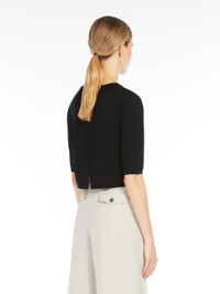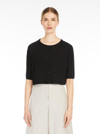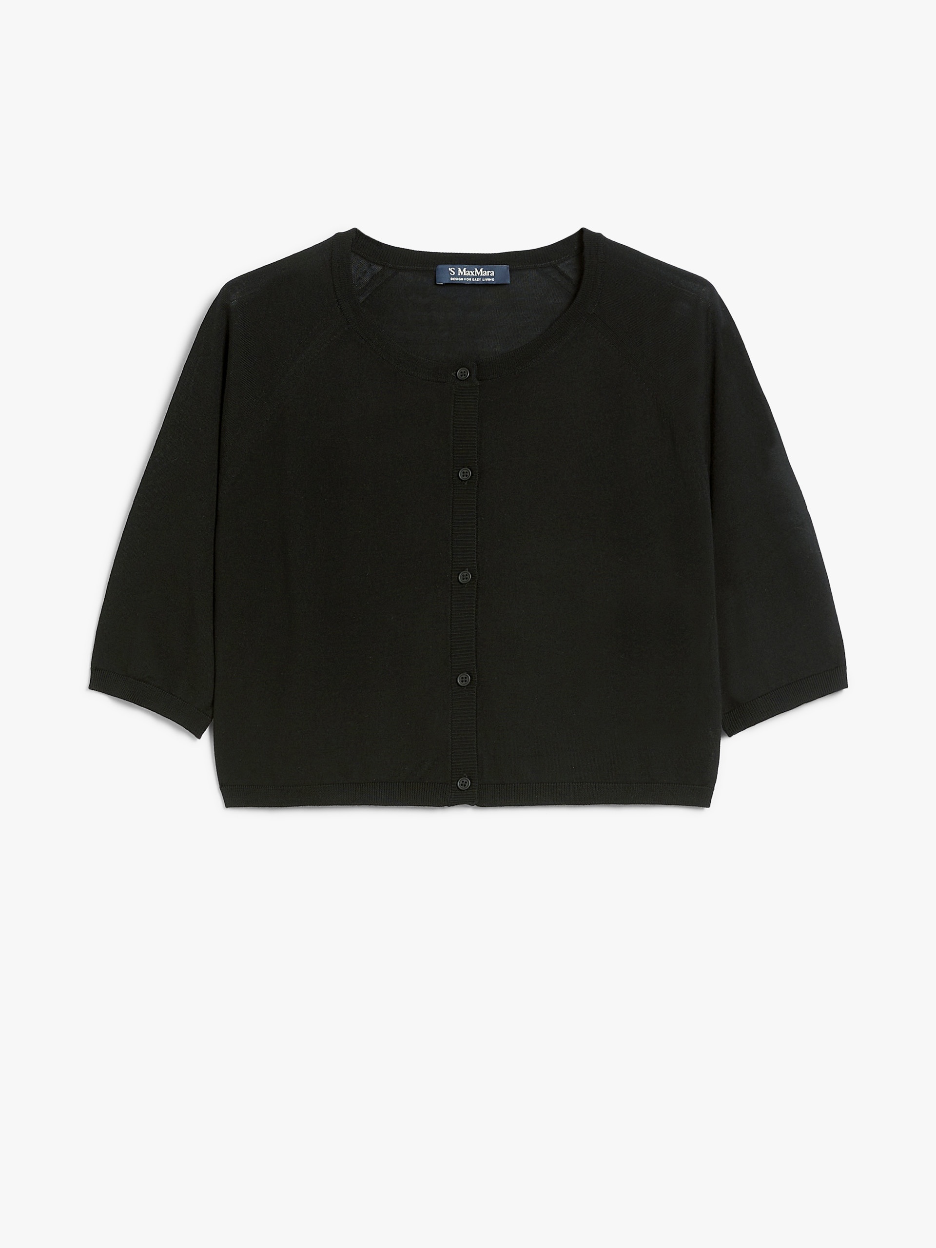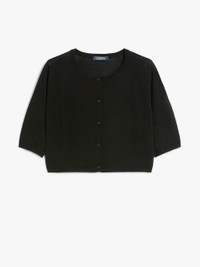 DETAILS Shrug in pure wool yarn, with round neckline and three-quarter raglan sleeves. Finished with a small central slit on the back and ribbed edges. Button fastening at the front. COMPOSITION AND CARE 100% virgin wool. Hand wash cold; do not bleach; do not tumble dry; flat drying in the shade; cool iron; professionally dry clean perchloroethylene - mild process; do not wet clean.; iron with a cloth between.; using neutral detergent.; turn the articles inside out before washing.; to be ironed on reverse. Distributed by Max Mara S.r.l., registered office in Reggio Emilia (Italy), Via Giulia Maramotti 4, 42124 (IT)