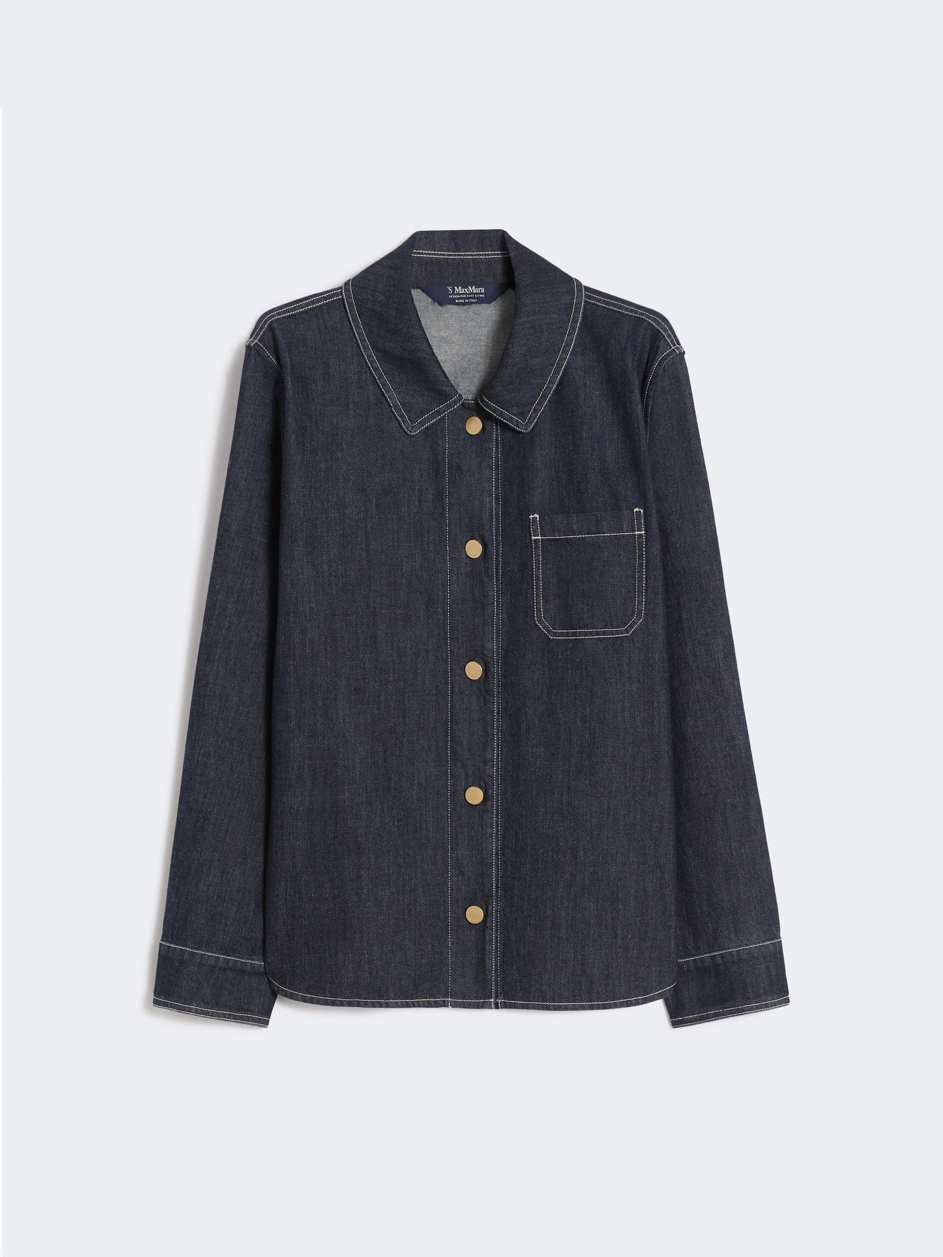 DETAILS Sports shirt with left-side chest pocket. - Shirt in garment-dyed indigo pure cotton denim - Shirt collar and double cuffs - Long set-in sleeves - Gold-coloured tack button fastening on the front - Contrasting ecru-coloured topstitching - Customised jacquard label on the undercollar COMPOSITION AND CARE 93% cotton, 7% kapok. Machine wash cold delicate cycle; do not bleach; do not tumble dry; line drying in the shade; cool iron; professionally dry clean perchloroethylene - mild process.; wash the garment while it is fastened.; take care when wearing light-coloured clothes or accessories because, with the heat of the body, the indigo fabric , may fade and stain. be careful while sitting on light coloured surfaces, especially if wet. wash garments separately and always turned inside out. hang the garment turned inside out by avoiding to expose it to direct sunlight. avoid removing isolated stains. Distributed by Max Mara S.r.l., registered office in Reggio Emilia (Italy), Via Giulia Maramotti 4, 42124 (IT) Collection: 'S Max Mara Product code: 9191056106001 - SMMENFASI