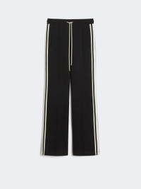 DETAILS Drawstring trousers with a distinctive technical feel. - Cotton jersey trousers - Straight leg - Elasticated waist with cord detail - Welt side pockets - Welt rear pocket - Contrasting side band with embroidered Max Mara detail COMPOSITION AND CARE Jersey fabric 78% cotton, 16% polyester, 6% elastane; - exclusive of embroideries. Hand wash cold (40°c max); do not bleach; do not tumble dry; flat drying in the shade; cool iron; professionally dry clean perchloroethylene - mild process; do not wet clean.; iron with a cloth between.; using neutral detergent.; don’t rub.; protect accessories before washing.; turn the articles inside out before washing.; to be ironed on reverse. Distributed by Max Mara S.r.l., registered office in Reggio Emilia (Italy), Via Giulia Maramotti 4, 42124 (IT) Collection: 'S Max Mara Product code: 9781016106002 - SMMVENTO