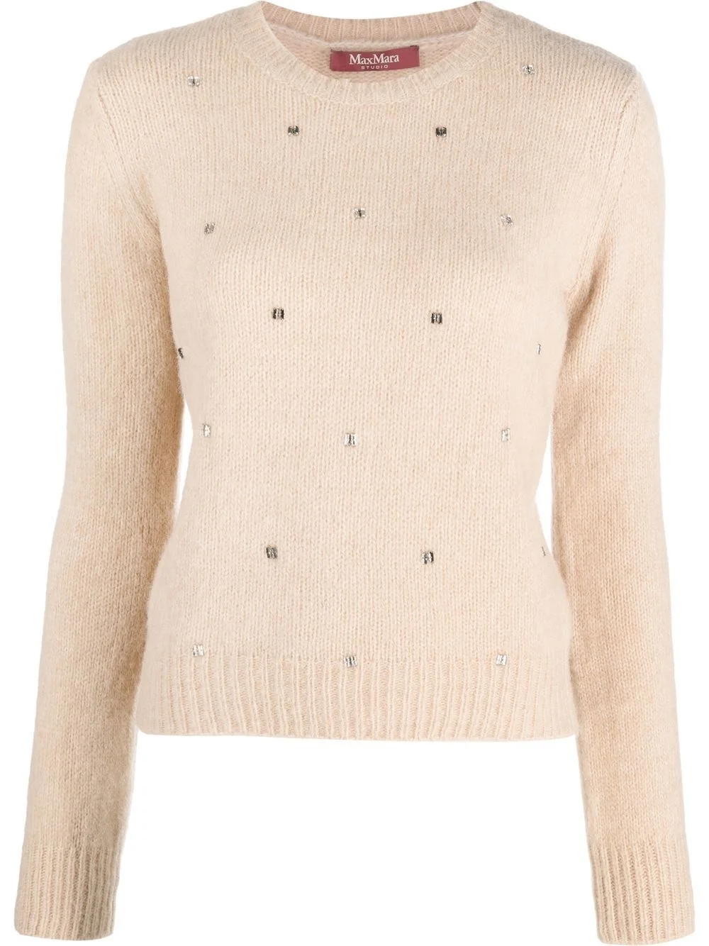 crew-neck long-sleeve jumper camel brown fine knit ribbed-knit edge sequin detailing crew neck long sleeves straight hem Imported Composition Wool 43%, Alpaca Wool 29%, Polyamide 28% SIZE & FIT Model measurements Height 5 ft 9 in(1.76 m) Bust/Chest 33.07 in(84 cm) Hips 34.64 in(88 cm) Waist 25.59 in(65 cm) FittingInformation This piece fits true to size. We recommend you get your regular size Cut for a slim fit Made with a mid-weight fabric Washing instructions Hand Wash