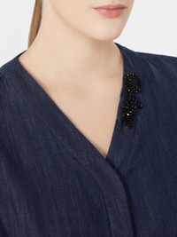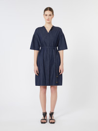 DETAILS Short dress with matching belt to highlight the silhouette. Garment-washed pure cotton denim dress Straight cut V-neck with jewel appliques Short, flared sleeves with dropped shoulders Concealed button fastening at the front Side inset pockets Gathered waist seam on the back COMPOSITION AND CARE Fabric 100% cotton; lining 100% cotton; - exclusive of decoration. Machine wash cold delicate cycle; do not bleach; do not tumble dry; line drying in the shade; cool iron; professionally dry clean perchloroethylene - mild process.; wash the garment while it is fastened.; do not iron the buttons.; remove the decorations before washing.; take care when wearing light-coloured clothes or accessories because, with the heat of the body, the indigo fabric , may fade and stain. be careful while sitting on light coloured surfaces, especially if wet. wash garments separately and always turned inside out. hang the garment turned inside out by avoiding to expose it to direct sunlight. avoid removing isolated stains.; contains non-textile parts of animal origin. Distributed by Max Mara S.r.l., registered office in Reggio Emilia (Italy), Via Giulia Maramotti 4, 42124 (IT)