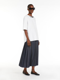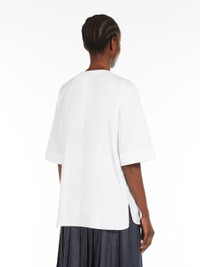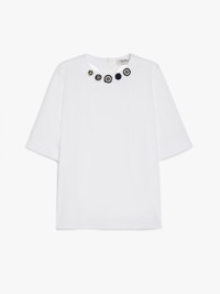 DETAILS Stretch cotton poplin blouse featuring short set-in sleeves and a subtle high-low rounded hem design. The neckline is embellished with removable embroidered detail. Concealed zip fastening at the back. COMPOSITION AND CARE Fabric 80% cotton, 18% polyamide, 2% elastane; - exclusive of decoration. Machine wash cold delicate cycle; do not bleach; do not tumble dry; line drying in the shade; cool iron; professionally dry clean perchloroethylene - mild process.; remove the decorations before washing. Distributed by Max Mara S.r.l., registered office in Reggio Emilia (Italy), Via Giulia Maramotti 4, 42124 (IT)