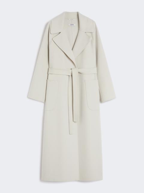 DETAILS Long coat with an enveloping wraparound fit. - Coat in hand-sewn double-faced pure wool fabric - Wide lapel collar - Long raglan sleeves - Belt fastening - Patch front pockets - Central rear vent - Unlined model COMPOSITION AND CARE Fabric 100% virgin wool; - except joining thread. Do not wash; do not bleach; do not tumble dry; cool iron; professionally dry clean perchloroethylene - mild process; do not wet clean. Distributed by Max Mara S.r.l., registered office in Reggio Emilia (Italy), Via Giulia Maramotti 4, 42124 (IT)