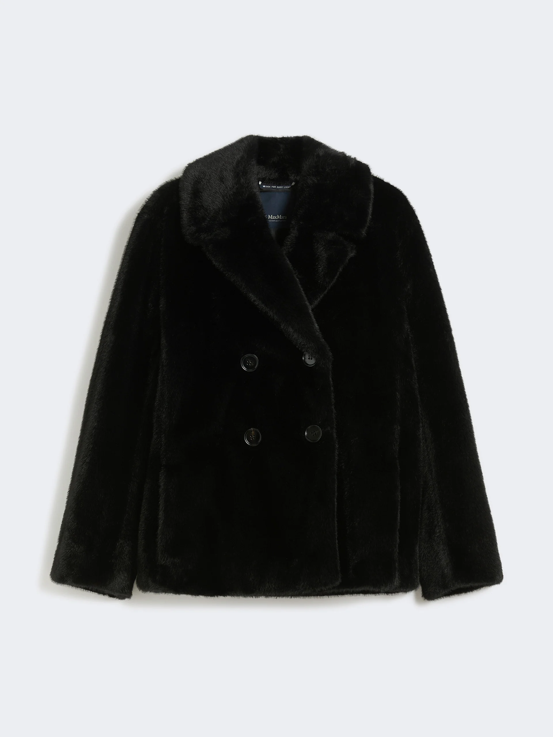DETAILS Double-breasted jacket featuring an enveloping silhouette with a slightly cropped cut. Faux fur jacket Lapel collar Long set-in sleeves Visible front fastening with horn buttons Side inset pockets Lined COMPOSITION AND CARE Jersey fabric 100% polyester; lining 55% polyester, 45% viscose. Do not wash; do not bleach; do not tumble dry; do not iron; professionally dry clean perchloroethylene - mild process; do not wet clean.; wash the garment while it is fastened.; do not iron the buttons.; protect buttons before washing.; turn the articles inside out before washing.; contains non-textile parts of animal origin. Distributed by Max Mara S.r.l., registered office in Reggio Emilia (Italy), Via Giulia Maramotti 4, 42124 (IT)