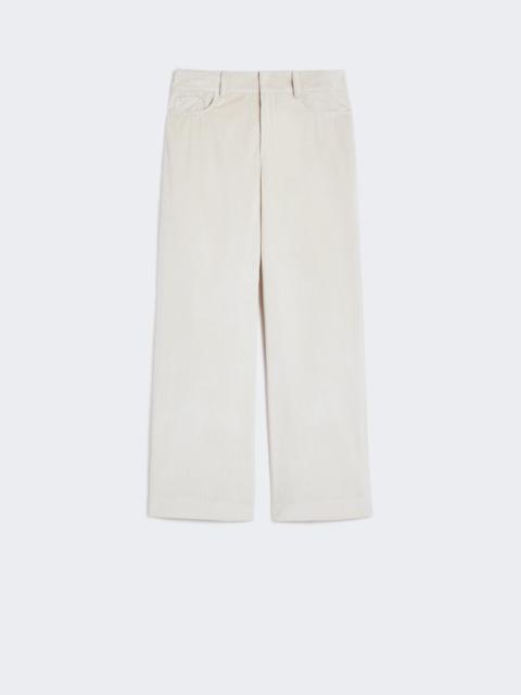 DETAILS Regular-fit trousers with a distinctive 5-pocket design. Trousers in 500-line pure cotton velvet fabric Flared mid-rise design High-cut waistband with a fly-covered zip and hook-and-bar fastening Welt rear pockets Belt loops COMPOSITION AND CARE 100% cotton. Do not wash; do not bleach; do not tumble dry; cool iron; professionally dry clean perchloroethylene - mild process; do not wet clean.; wash the garment while it is fastened.; do not iron the buttons.; protect buttons before washing.; contains non-textile parts of animal origin. Distributed by Max Mara S.r.l., registered office in Reggio Emilia (Italy), Via Giulia Maramotti 4, 42124 (IT)