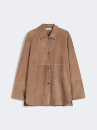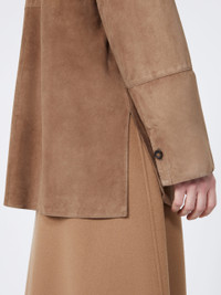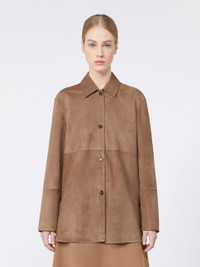 DETAILS Single-breasted jacket finished with leather-goods seams and stitching. - Lambskin suede jacket - Slightly flared lines with side slits - Shirt collar and set-in sleeves with deep cuffs - Front fastening with horn buttons - Cuffs with slit and horn button - Semi-lined with silk sleeves COMPOSITION AND CARE Style in lamb leather; lining 100% silk. Do not wash; do not bleach; do not tumble dry; do not iron; do not dry clean; do not wet clean.; do not wash or dry clean by fabric methods. clean only by leather and fur specialists.; do not iron the buttons.; care should be taken with light-coloured garments and accessories because body heat could lead the leather to colour loss and staining. care should be taken when sitting on light-coloured surfaces, especially if damp. avoid lengthy exposure to direct light or heat sources. do not store garments in plastic bags for long periods. Distributed by Max Mara S.r.l., registered office in Reggio Emilia (Italy), Via Giulia Maramotti 4, 42124 (IT) Collection: 'S Max Mara Product code: 9446015306001 - ESTATE