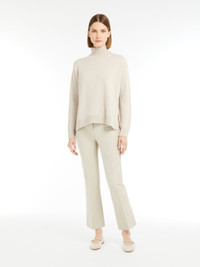 DETAILS Trousers in double-faced stretch cotton and viscose fabric featuring a slim fit that flares slightly at the hem, in addition to pressed pleat detail on the leg and belt loops. High-cut waistband and a fly-covered zip and hook-and-bar fastening. COMPOSITION AND CARE 47% viscose, 45% cotton, 8% elastane. Do not wash; do not bleach; do not tumble dry; cool iron; professionally dry clean perchloroethylene - mild process; do not wet clean.; wash the garment while it is fastened.; do not iron the buttons.; protect buttons before washing.; contains non-textile parts of animal origin. Distributed by Max Mara S.r.l., registered office in Reggio Emilia (Italy), Via Giulia Maramotti 4, 42124 (IT)