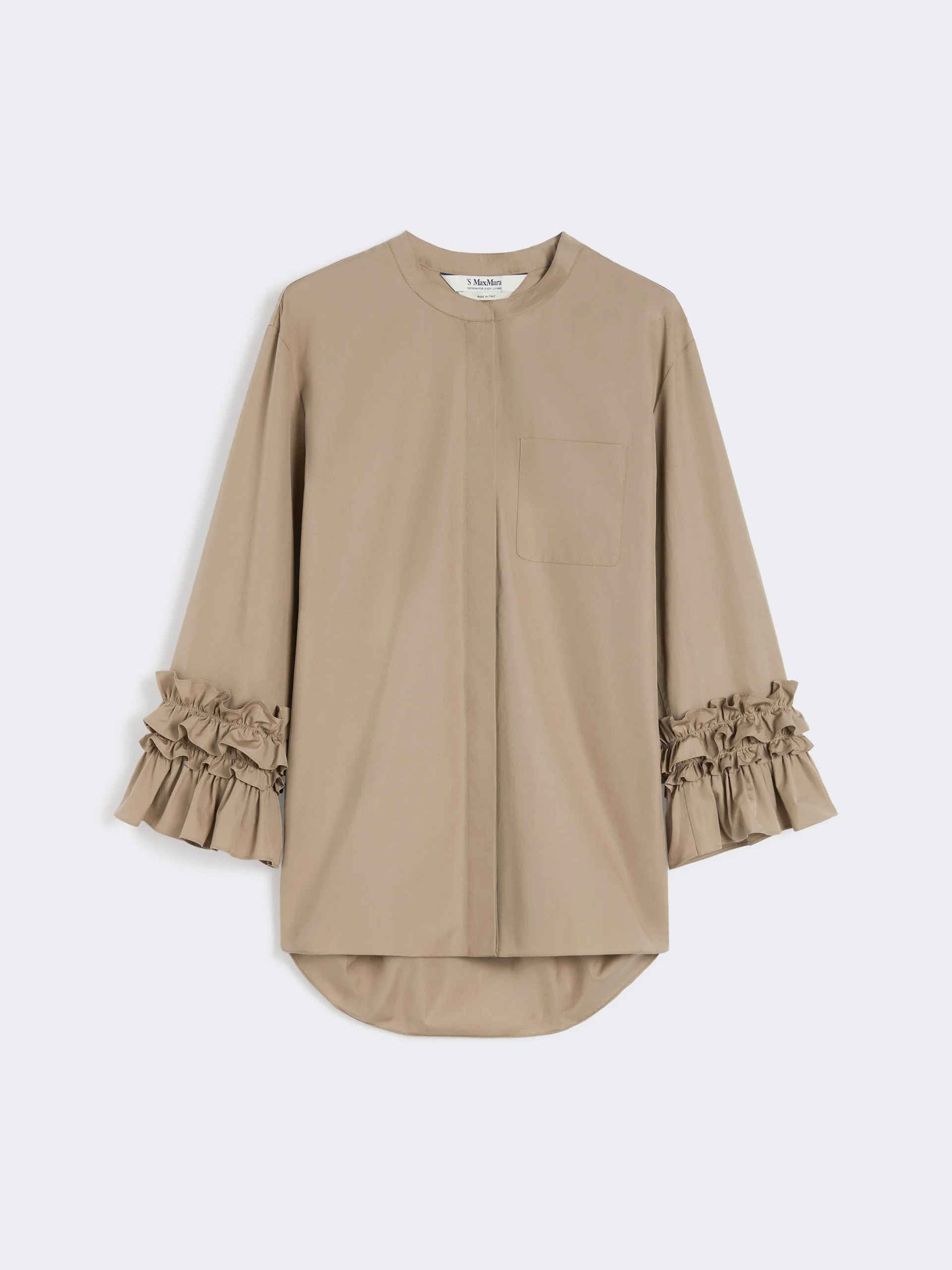 DETAILS Flared shirt with fabric ruffles that trim the sleeve cuff. - Washed pure cotton poplin shirt - Mandarin collar - Long set-in sleeves - Concealed button fastening at the front - Patch pocket on the chest - Yoke seam with deep reverse pleat on the back - Hemline longer at the back, with rounded side slits COMPOSITION AND CARE 100% cotton. Machine wash cold delicate cycle; do not bleach; do not tumble dry; line drying in the shade; cool iron; professionally dry clean perchloroethylene - mild process.; wash the garment while it is fastened.; contains non-textile parts of animal origin. Distributed by Max Mara S.r.l., registered office in Reggio Emilia (Italy), Via Giulia Maramotti 4, 42124 (IT)