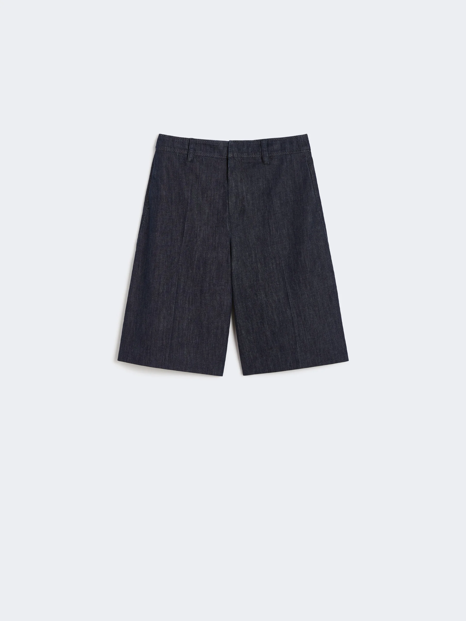 DETAILS Straight-cut Bermuda shorts with trouser crease and tailored construction. - The main fabric contains at least 50% cotton fibre, grown according to organic farming standards - Garment-washed cotton and kapok denim Bermuda shorts - Fastening with a wide waistband tab, zip fly and small hook - Slant pockets at the sides - Welt pockets at the back - Finished with a contrasting tailored pick stitch and belt loops at the waist COMPOSITION AND CARE Fabric 93% cotton, 7% kapok; lining 100% cotton. Machine wash cold delicate cycle; do not bleach; do not tumble dry; line drying in the shade; cool iron; professionally dry clean perchloroethylene - mild process.; wash the garment while it is fastened.; do not iron the buttons.; protect buttons before washing.; take care when wearing light-coloured clothes or accessories because, with the heat of the body, the indigo fabric , may fade and stain. be careful while sitting on light coloured surfaces, especially if wet. wash garments separately and always turned inside out. hang the garment turned inside out by avoiding to expose it to direct sunlight. avoid removing isolated stains.; contains non-textile parts of animal origin. Distributed by Max Mara S.r.l., registered office in Reggio Emilia (Italy), Via Giulia Maramotti 4, 42124 (IT)