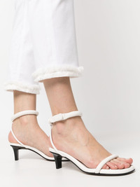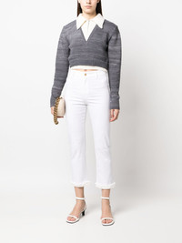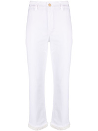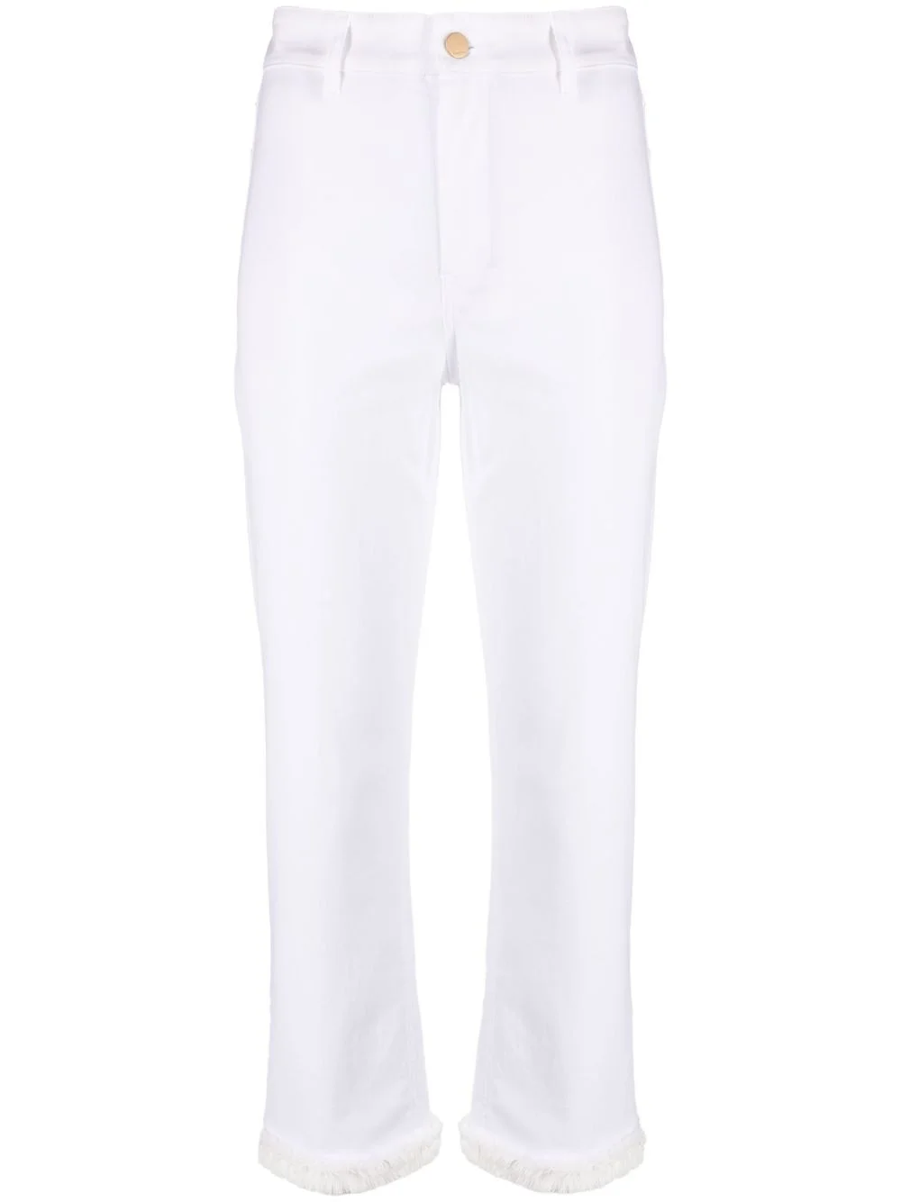 frayed-edge slim-fit trousers off-white stretch-cotton front button and zip fastening two rear patch pockets belt loops frayed edge slim cut Made in Italy Composition Cotton 98%, Elastane 2% SIZE & FIT Model measurements Height 5 ft 11 in(1.8 m) Bust/Chest 31.49 in(80 cm) Hips 36.22 in(92 cm) Waist 25.59 in(65 cm) FittingInformation Designed for a slim fit, these trousers offer a close fit at the waist, allowing a comfortable close fit and some movement over the leg Made from a midweight stretch fabric, this piece offers elasticity and flexibility when worn This piece fits true to size – take your usual size