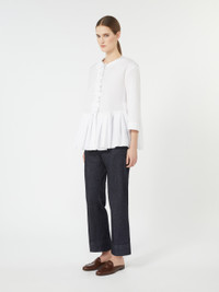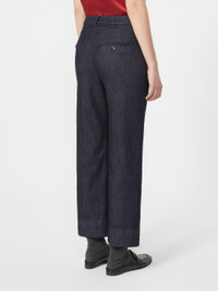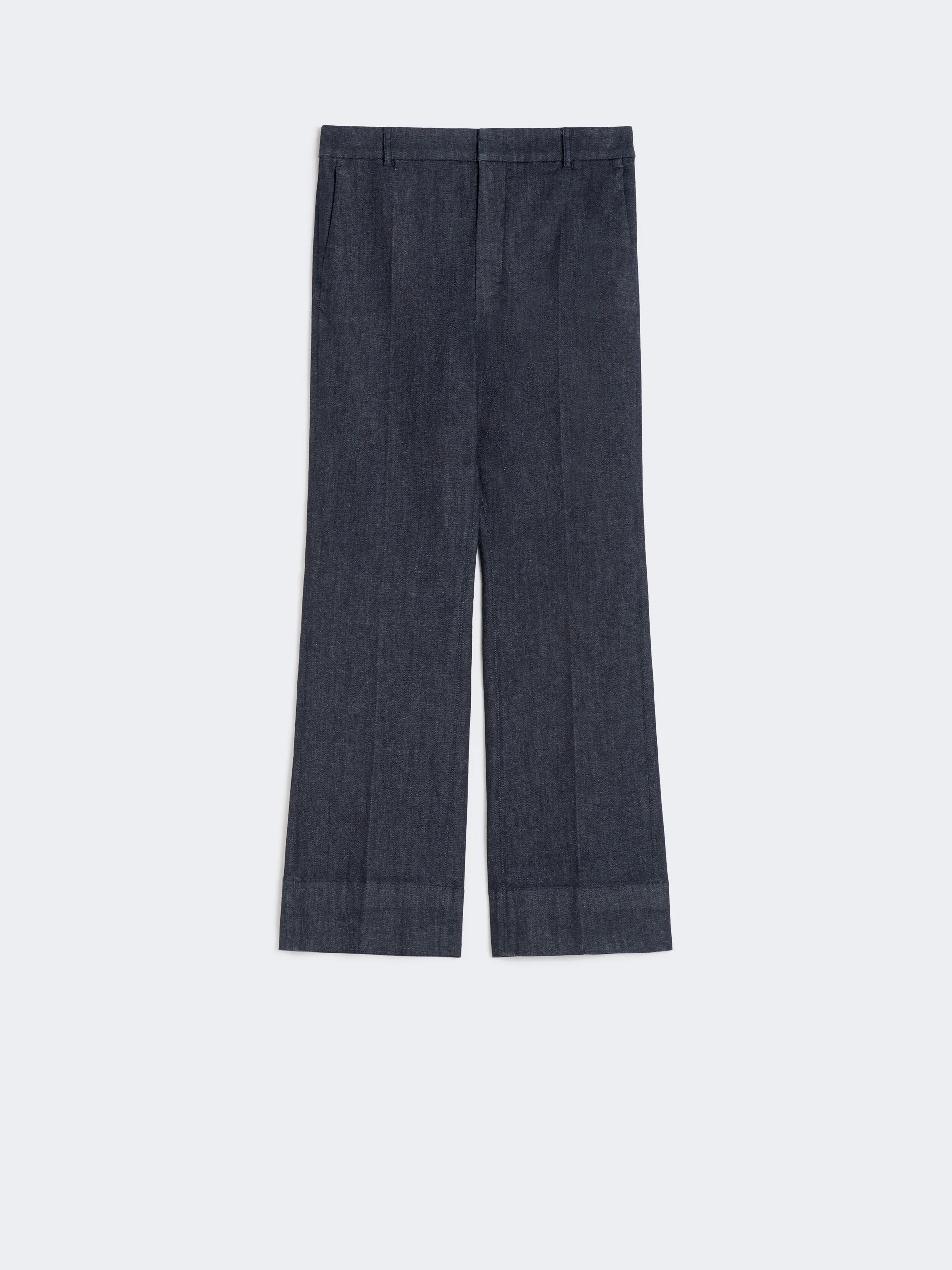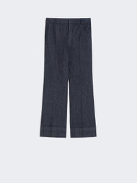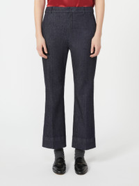 DETAILS Slightly flared trousers featuring pressed pleat detail. - Trousers in garment-dyed stretch cotton denim fabric - Slim fit - High-cut waistband with a fly-covered zip and hook-and-bar fastening - Slant side pockets - Double-welt rear pockets with horn button detail - Belt loops COMPOSITION AND CARE 90% cotton, 8% elastomultiester, 2% elastane. Machine wash cold delicate cycle; do not bleach; do not tumble dry; line drying in the shade; cool iron; professionally dry clean perchloroethylene - mild process.; wash the garment while it is fastened.; do not iron the buttons.; protect buttons before washing.; take care when wearing light-coloured clothes or accessories because, with the heat of the body, the indigo fabric , may fade and stain. be careful while sitting on light coloured surfaces, especially if wet. wash garments separately and always turned inside out. hang the garment turned inside out by avoiding to expose it to direct sunlight. avoid removing isolated stains.; contains non-textile parts of animal origin. Distributed by Max Mara S.r.l., registered office in Reggio Emilia (Italy), Via Giulia Maramotti 4, 42124 (IT)