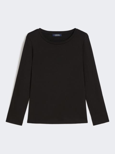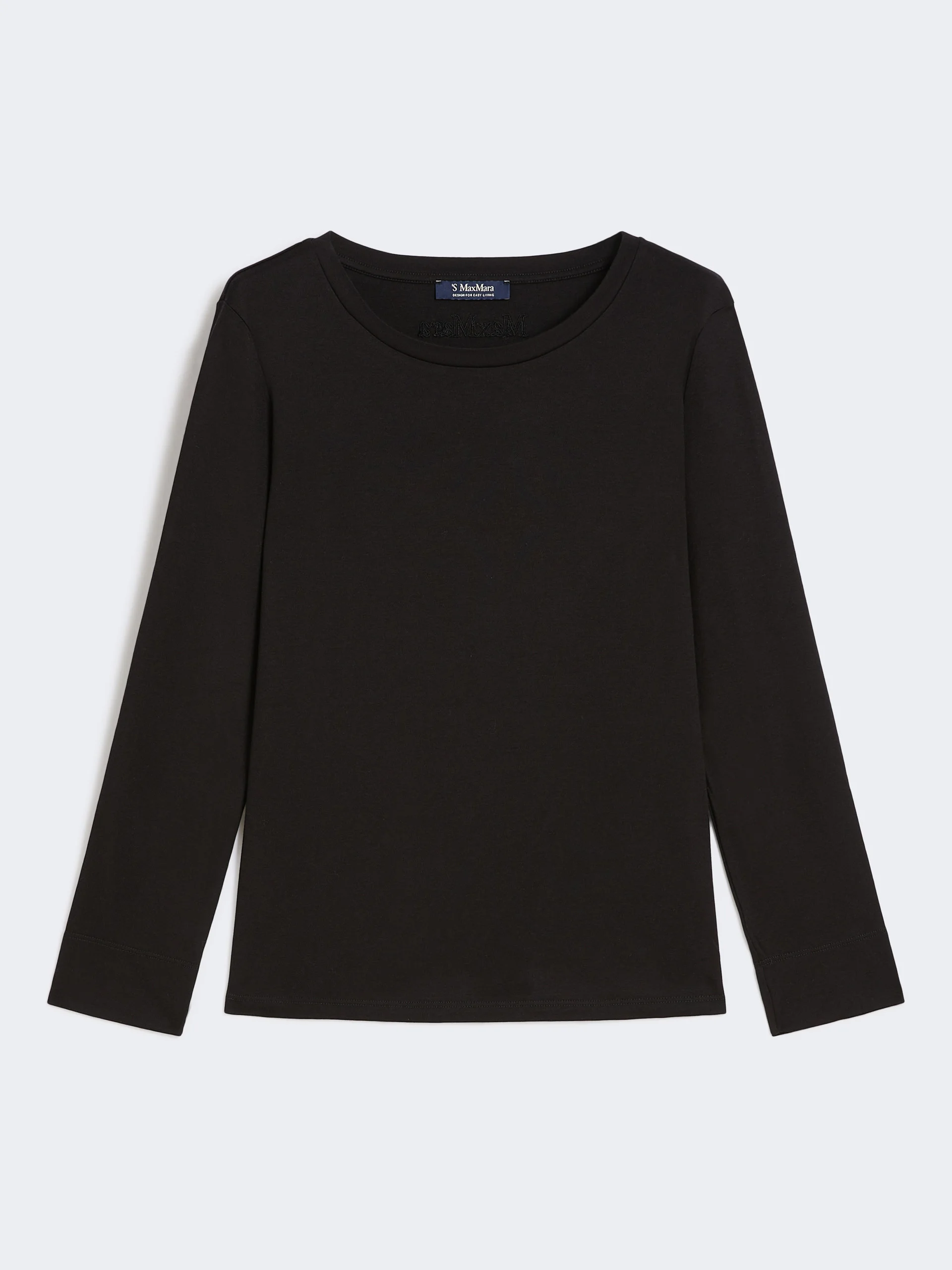 DETAILS Basic T-shirt customised with an embroidered logo on the back of the neck. Cotton and modal jersey T-shirt Regular fit Crew neck Long set-in sleeves Straight hem COMPOSITION AND CARE Jersey fabric 50% cotton, 50% modal; - exclusive of embroideries. Machine wash cold delicate cycle; do not bleach; do not tumble dry; flat drying in the shade; cool iron; professionally dry clean perchloroethylene - mild process; professional wet cleaning - very mild process.; iron with a cloth between.; using neutral detergent. Distributed by Max Mara S.r.l., registered office in Reggio Emilia (Italy), Via Giulia Maramotti 4, 42124 (IT)