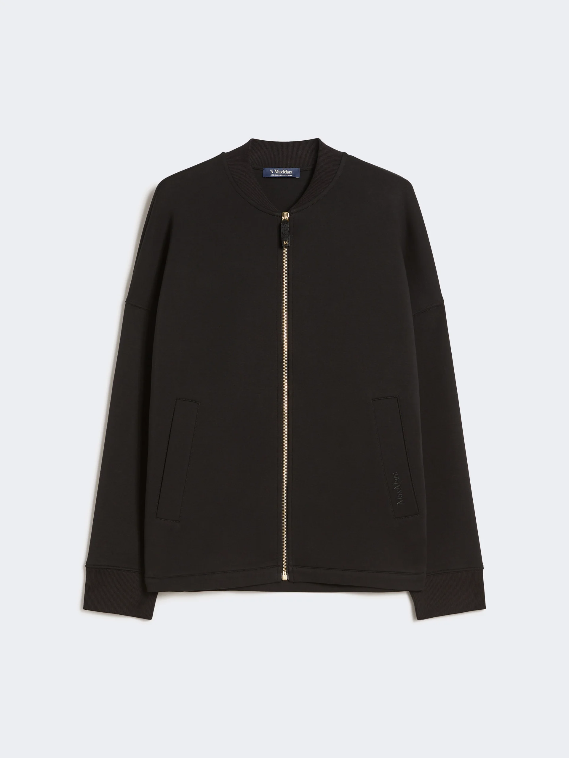 DETAILS Oversized jacket with bomber jacket-style details and Max Mara embroidery on the left pocket. - Scuba jersey jacket - Loose fit - Rib-knit collar and cuffs - Long low set-in sleeves - Metal zip fastening on the front - Welt side pockets - Unlined model COMPOSITION AND CARE Jersey fabric 78% cotton, 16% polyester, 6% elastane; - exclusive of embroideries. Hand wash cold (40°c max); do not bleach; do not tumble dry; flat drying in the shade; cool iron; professionally dry clean perchloroethylene - mild process; do not wet clean.; iron with a cloth between.; using neutral detergent.; before cleaning the style remove the accessories.; don’t rub.; turn the articles inside out before washing.; to be ironed on reverse. Distributed by Max Mara S.r.l., registered office in Reggio Emilia (Italy), Via Giulia Maramotti 4, 42124 (IT) Collection: 'S Max Mara Product code: 9911016106002 - SMMRADIOSO