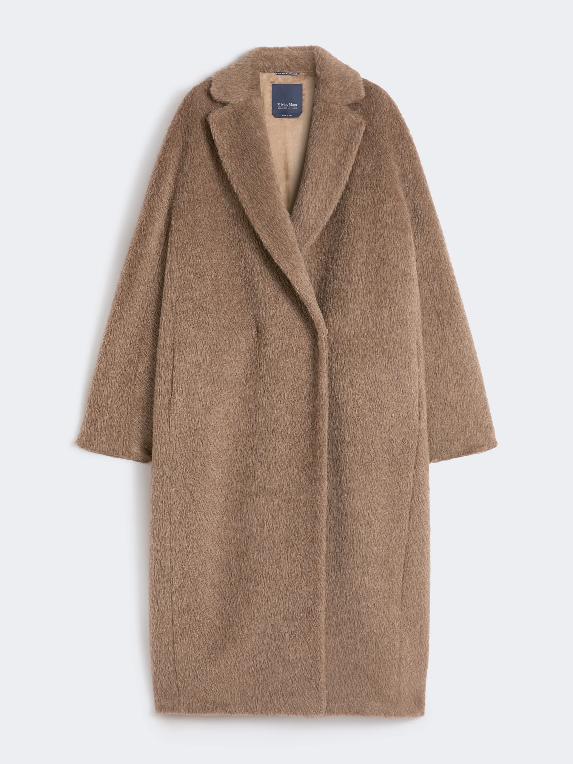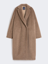 DETAILS Long coat distinguished by a very soft and fluffy texture. Alpaca, wool and cashmere long-pile coat Oversized with central slit at the back Lapel collar Sleeves are kimono style at the front and raglan at the back Concealed snap-button fastening Side inset pockets Lined COMPOSITION AND CARE Fabric 59% alpaca, 38% virgin wool, 3% cashmere; lining 69% acetate, 31% cupro. Do not wash; do not bleach; do not tumble dry; cool iron; professionally dry clean perchloroethylene - mild process; do not wet clean. Distributed by Max Mara S.r.l., registered office in Reggio Emilia (Italy), Via Giulia Maramotti 4, 42124 (IT)