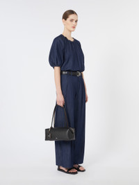 DETAILS Wide trousers with double pleats on the front that add volume. Garment-washed pure cotton denim trousers Wide leg Regular waist with belt loops Fastening with a wide waistband tab, zip fly and small hook Slant pockets at the sides and welt pockets at the back Removable jewel applique on the belt loop at the waist COMPOSITION AND CARE Fabric 100% cotton; - exclusive of decoration. Machine wash cold delicate cycle; do not bleach; do not tumble dry; line drying in the shade; cool iron; professionally dry clean perchloroethylene - mild process.; wash the garment while it is fastened.; do not iron the buttons.; protect buttons before washing.; remove the decorations before washing.; take care when wearing light-coloured clothes or accessories because, with the heat of the body, the indigo fabric , may fade and stain. be careful while sitting on light coloured surfaces, especially if wet. wash garments separately and always turned inside out. hang the garment turned inside out by avoiding to expose it to direct sunlight. avoid removing isolated stains.; contains non-textile parts of animal origin. Distributed by Max Mara S.r.l., registered office in Reggio Emilia (Italy), Via Giulia Maramotti 4, 42124 (IT)