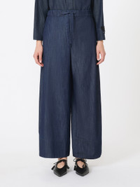 DETAILS Jogger-style trousers with elasticated waist and adjustable drawstring. Garment-washed pure cotton denim trousers Comfortable line with wide leg Side inset pockets Patch pocket on the back on the right-hand side COMPOSITION AND CARE Fabric 100% cotton; lining 96% cotton, 4% elastane. Machine wash cold delicate cycle; do not bleach; do not tumble dry; line drying in the shade; cool iron; professionally dry clean perchloroethylene - mild process.; wash the garment while it is fastened.; do not iron the buttons.; protect buttons before washing.; take care when wearing light-coloured clothes or accessories because, with the heat of the body, the indigo fabric , may fade and stain. be careful while sitting on light coloured surfaces, especially if wet. wash garments separately and always turned inside out. hang the garment turned inside out by avoiding to expose it to direct sunlight. avoid removing isolated stains.; contains non-textile parts of animal origin. Distributed by Max Mara S.r.l., registered office in Reggio Emilia (Italy), Via Giulia Maramotti 4, 42124 (IT)