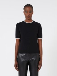 DETAILS Basic jumper, also available with contrasting edges on the collar and cuffs. Pure wool yarn jumper Straight cut Crew neck Short set-in sleeves Straight hem Ribbed trim COMPOSITION AND CARE 100% wool. Hand wash cold (40°c max); do not bleach; do not tumble dry; flat drying in the shade; cool iron; professionally dry clean perchloroethylene - mild process; do not wet clean.; iron with a cloth between.; using neutral detergent.; turn the articles inside out before washing.; to be ironed on reverse. Distributed by Max Mara S.r.l., registered office in Reggio Emilia (Italy), Via Giulia Maramotti 4, 42124 (IT)