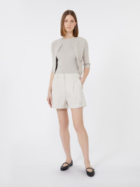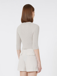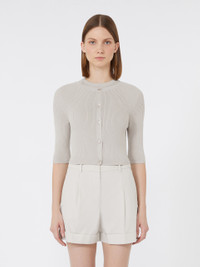 DETAILS Cropped cardigan with a small rib-knit pattern. Pure cotton yarn cardigan Straight cut Crew neck Three-quarter raglan sleeves Button fastening at the front Straight hem COMPOSITION AND CARE 100% cotton. Hand wash cold (40°c max); do not bleach; do not tumble dry; flat drying in the shade; cool iron; professionally dry clean perchloroethylene - mild process; do not wet clean.; iron with a cloth between.; using neutral detergent.; turn the articles inside out before washing.; to be ironed on reverse. Distributed by Max Mara S.r.l., registered office in Reggio Emilia (Italy), Via Giulia Maramotti 4, 42124 (IT)