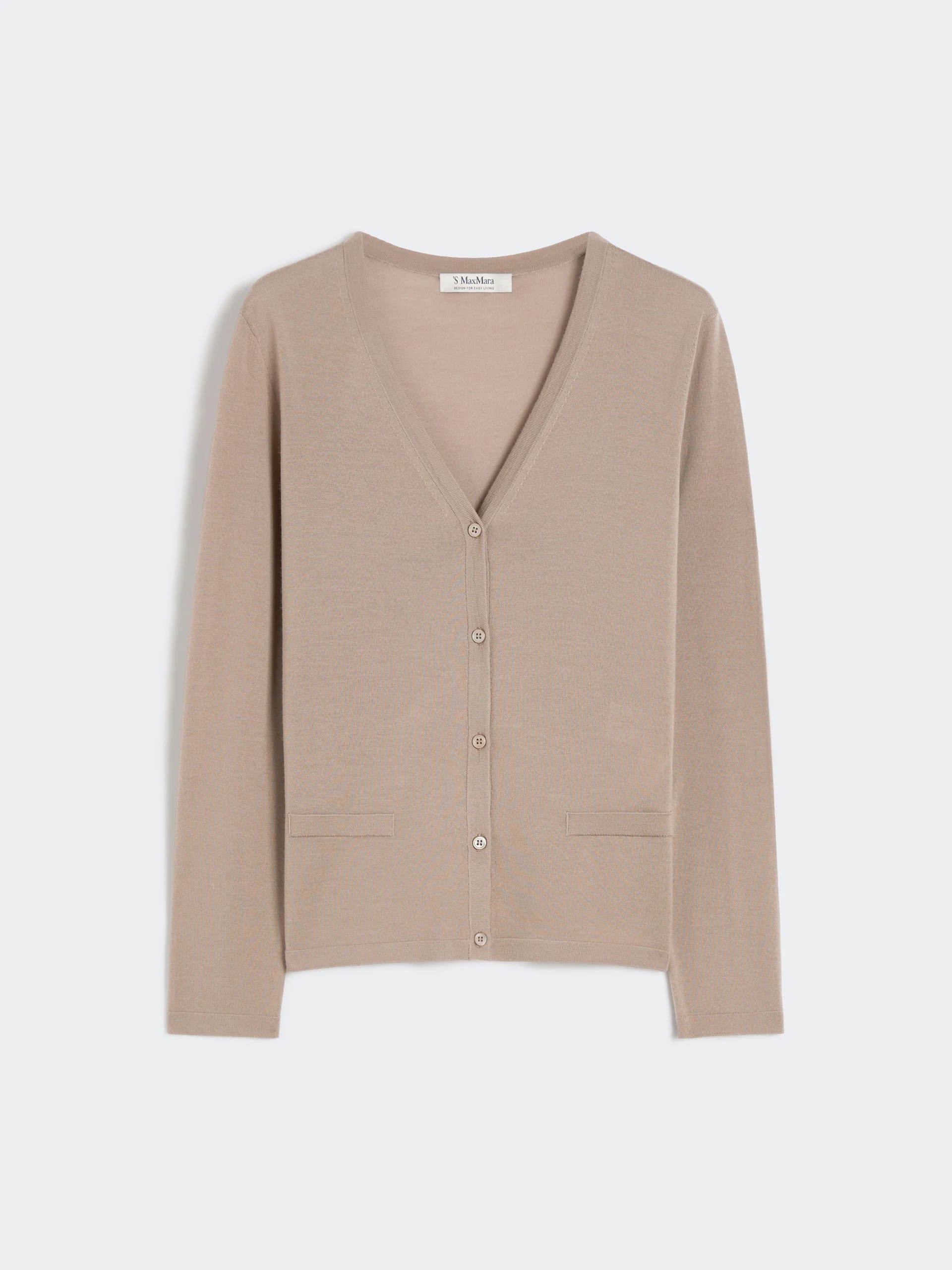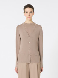 DETAILS Cardigan distinguished streamlined fit that highlights the silhouette. Pure wool yarn cardigan V neck Long set-in sleeves Single-breasted closure with visible buttons Horizontal welt pockets at the front COMPOSITION AND CARE 100% virgin wool. Hand wash cold (40°c max); do not bleach; do not tumble dry; flat drying in the shade; cool iron; professionally dry clean perchloroethylene - mild process; do not wet clean.; iron with a cloth between.; using neutral detergent.; turn the articles inside out before washing.; to be ironed on reverse. Distributed by Max Mara S.r.l., registered office in Reggio Emilia (Italy), Via Giulia Maramotti 4, 42124 (IT)