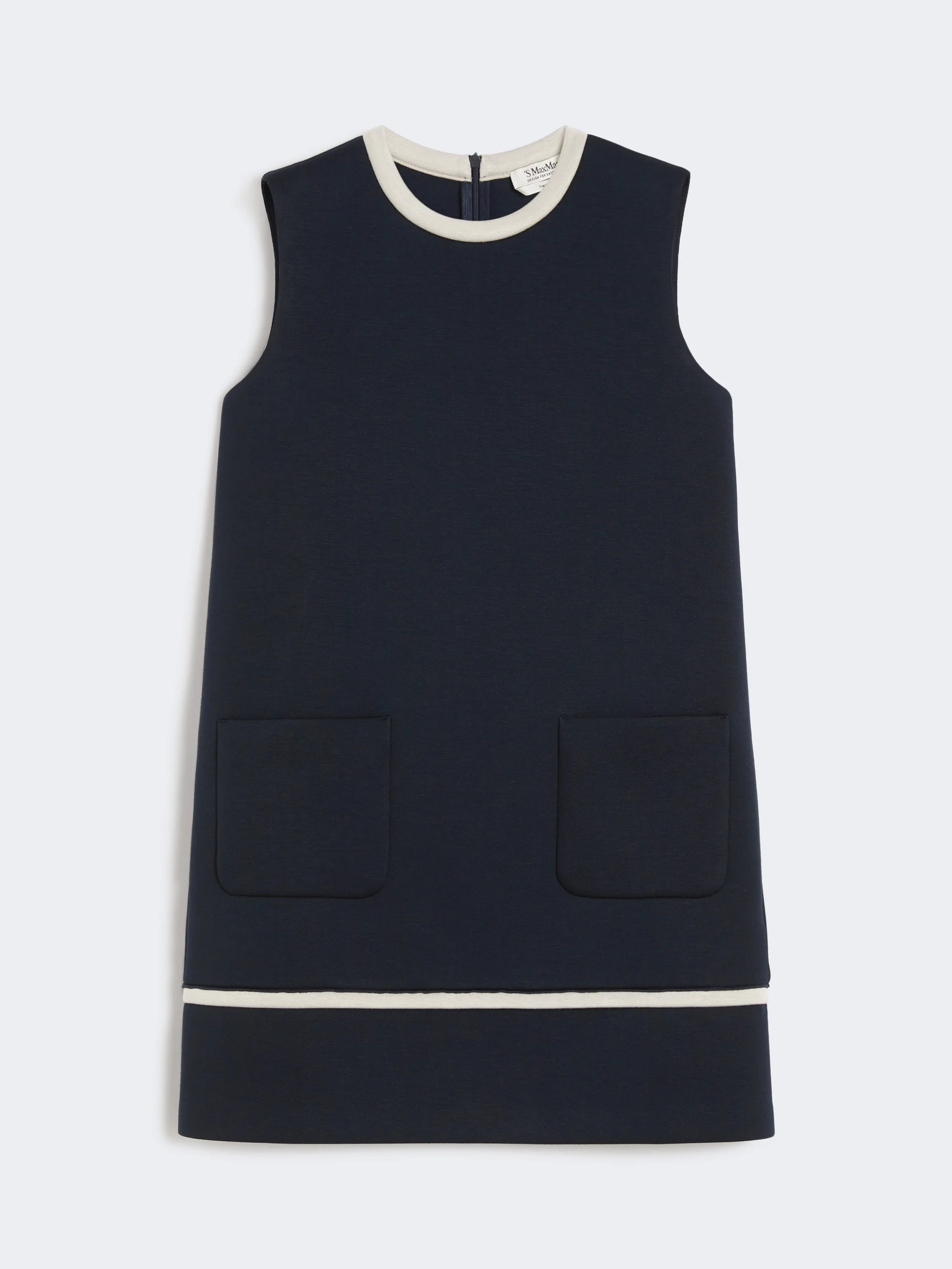 DETAILS Short sleeveless dress featuring a slightly flared line. - Bonded viscose jersey dress - Crew neck - Sleeveless - Back concealed zip fastening - Rounded patch pockets on the front - Edges finished with contrasting piping COMPOSITION AND CARE 96% viscose, 4% elastane. Hand wash cold (40°c max); do not bleach; do not tumble dry; drip line drying in the shade; cool iron; do not dry clean; do not wet clean.; iron with a cloth between.; using neutral detergent.; don’t rub.; turn the articles inside out before washing.; to be ironed on reverse. Distributed by Max Mara S.r.l., registered office in Reggio Emilia (Italy), Via Giulia Maramotti 4, 42124 (IT)