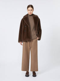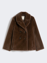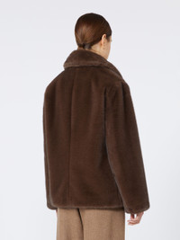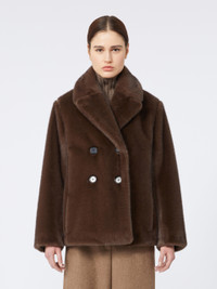 DETAILS Double-breasted jacket featuring an enveloping silhouette with a slightly cropped cut. Faux fur jacket Lapel collar Long set-in sleeves Visible front fastening with horn buttons Side inset pockets Lined COMPOSITION AND CARE Jersey fabric 100% polyester; lining 55% polyester, 45% viscose. Do not wash; do not bleach; do not tumble dry; do not iron; professionally dry clean perchloroethylene - mild process; do not wet clean.; wash the garment while it is fastened.; do not iron the buttons.; protect buttons before washing.; turn the articles inside out before washing.; contains non-textile parts of animal origin. Distributed by Max Mara S.r.l., registered office in Reggio Emilia (Italy), Via Giulia Maramotti 4, 42124 (IT)