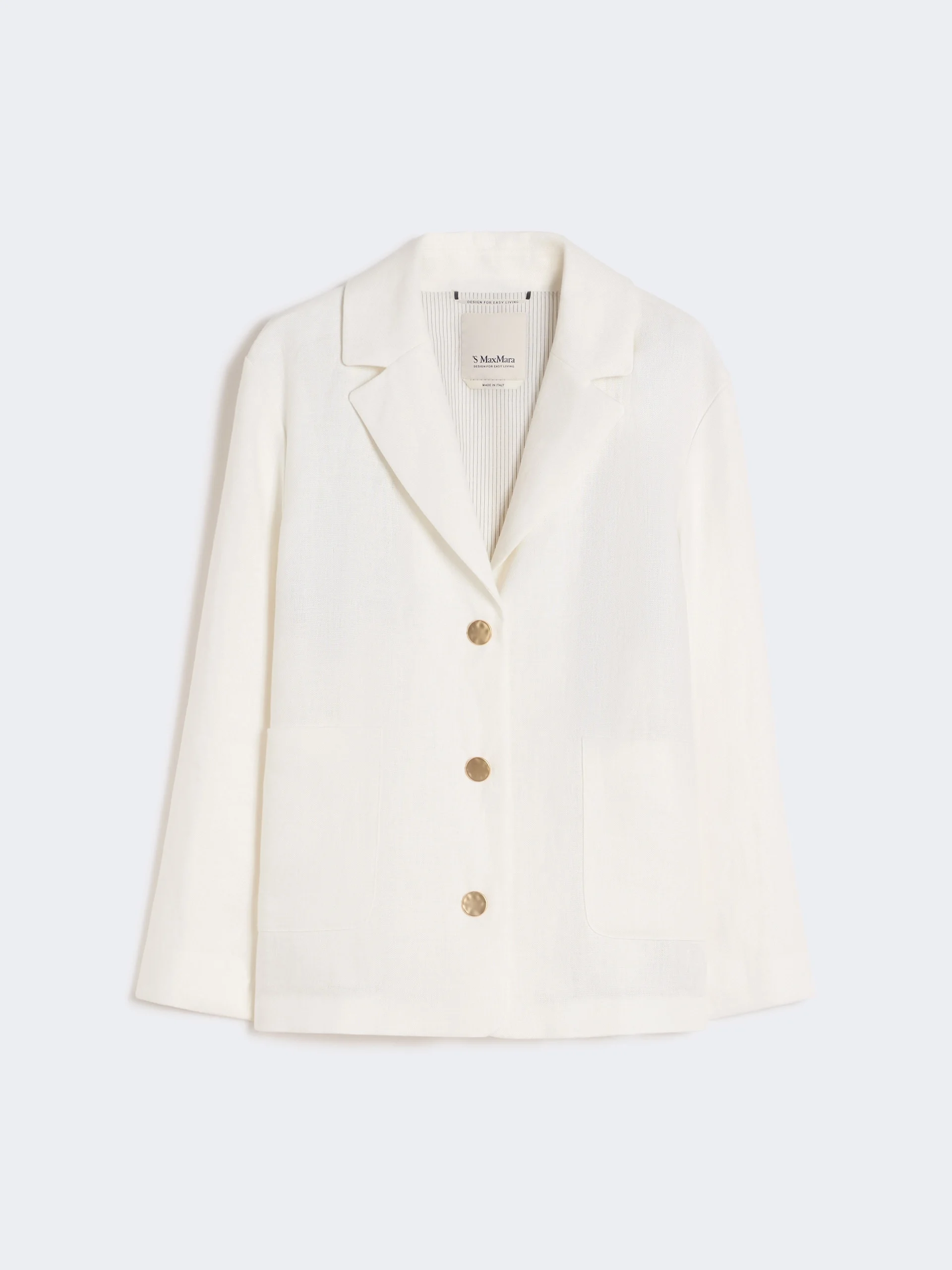 DETAILS Single-breasted jacket featuring a boxy cut and straight fit. - Jacket in heavy pure linen canvas - Lapel collar - Long set-in sleeves - Closure with three visible gold-coloured hammered metal buttons - Patch front pockets - Central rear slit - Half-lined model COMPOSITION AND CARE Fabric 100% flaxlinen; lining 92% cotton, 8% polyamide; sleeves lining 100% cotton. Do not wash; do not bleach; do not tumble dry; cool iron; professionally dry clean perchloroethylene - mild process; do not wet clean.; wash the garment while it is fastened.; protect buttons before washing.; turn the articles inside out before washing. Distributed by Max Mara S.r.l., registered office in Reggio Emilia (Italy), Via Giulia Maramotti 4, 42124 (IT) Collection: 'S Max Mara Product code: 9041056306001 - SMMCARLOTTA