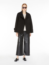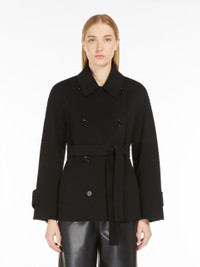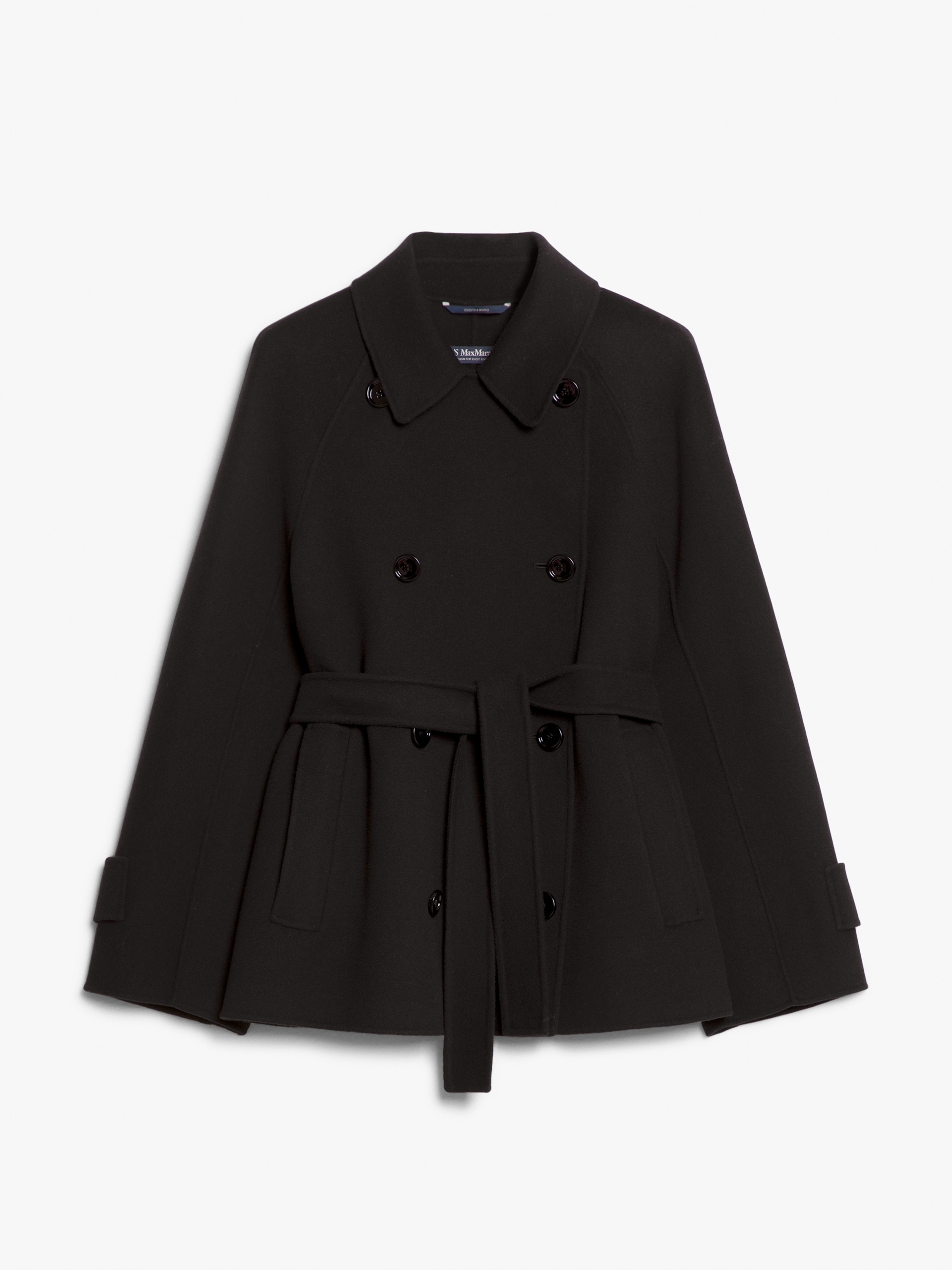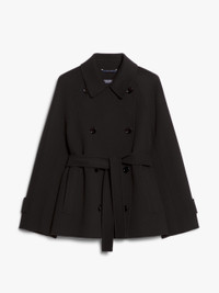 DETAILS Short trench coat in fine hand-sewn double-faced pure wool fabric with a wide lapel collar and welt side pockets. Double-breasted style in a boxy cut, finished with raglan sleeves with buttons on the cuff straps, a small central vent at the back and a matching belt to accentuate the silhouette. Button fastening. COMPOSITION AND CARE Fabric 100% virgin wool; - except joining thread. Do not wash; do not bleach; do not tumble dry; cool iron; professionally dry clean perchloroethylene - mild process; do not wet clean.; wash the garment while it is fastened.; turn the articles inside out before washing. Distributed by Max Mara S.r.l., registered office in Reggio Emilia (Italy), Via Giulia Maramotti 4, 42124 (IT)