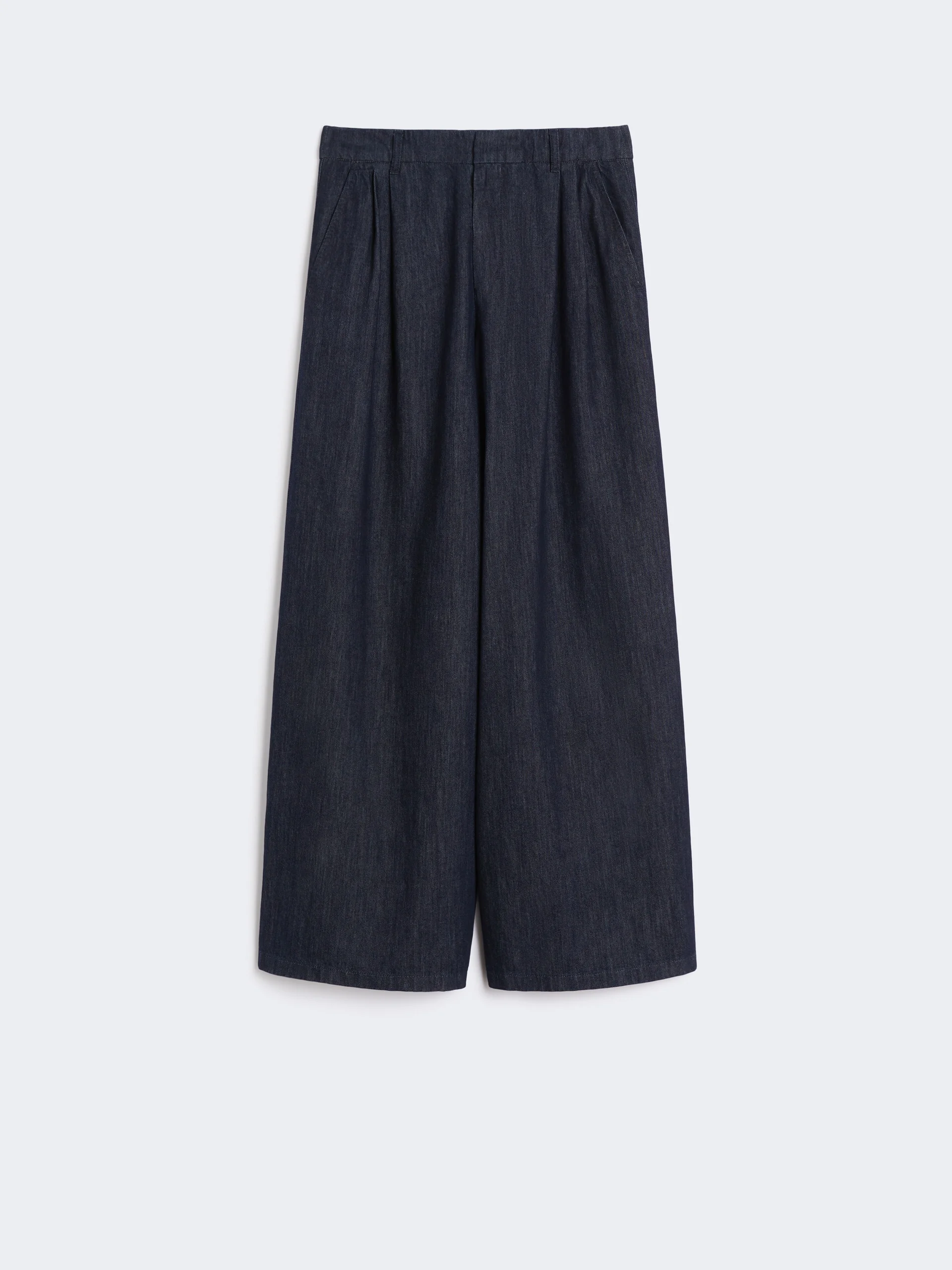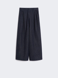 DETAILS Wide-leg trousers featuring double waist darts on the front. - The fabric of this item is made from at least 50% cotton fibers, grown and processed according to organic farming systems - Trousers in garment-washed cotton and kapok denim - High-cut waistband with a fly-covered zip and hook-and-bar fastening - Slant side pockets - Patch rear pockets - Belt loops - Branded rear hem tag. COMPOSITION AND CARE 93% cotton, 7% kapok. Machine wash cold delicate cycle; do not bleach; do not tumble dry; line drying in the shade; cool iron; do not dry clean.; wash the garment while it is fastened.; don’t iron the labels.; do not iron the buttons.; protect buttons before washing.; take care when wearing light-coloured clothes or accessories because, with the heat of the body, the indigo fabric , may fade and stain. be careful while sitting on light coloured surfaces, especially if wet. wash garments separately and always turned inside out. hang the garment turned inside out by avoiding to expose it to direct sunlight. avoid removing isolated stains.; contains non-textile parts of animal origin. Distributed by Max Mara S.r.l., registered office in Reggio Emilia (Italy), Via Giulia Maramotti 4, 42124 (IT)