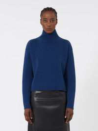 DETAILS Boxy-fit polo-neck sweater with a cropped waist cut. Wool and cashmere yarn sweater Mini cut and a relatively loose bodice High neck Drop-shoulder long sleeves Rib-knit trims Straight hem COMPOSITION AND CARE 80% wool, 20% cashmere. Hand wash cold (40°c max); do not bleach; do not tumble dry; flat drying in the shade; cool iron; professionally dry clean perchloroethylene - mild process; do not wet clean.; iron with a cloth between.; using neutral detergent.; turn the articles inside out before washing.; to be ironed on reverse. Distributed by Max Mara S.r.l., registered office in Reggio Emilia (Italy), Via Giulia Maramotti 4, 42124 (IT)