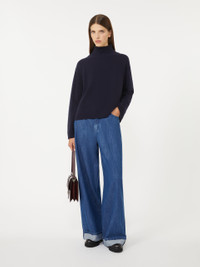 DETAILS Boxy-fit polo-neck sweater with a cropped waist cut. Wool and cashmere yarn sweater Mini cut and a relatively loose bodice High neck Drop-shoulder long sleeves Rib-knit trims Straight hem COMPOSITION AND CARE 80% wool, 20% cashmere. Hand wash cold (40°c max); do not bleach; do not tumble dry; flat drying in the shade; cool iron; professionally dry clean perchloroethylene - mild process; do not wet clean.; iron with a cloth between.; using neutral detergent.; turn the articles inside out before washing.; to be ironed on reverse. Distributed by Max Mara S.r.l., registered office in Reggio Emilia (Italy), Via Giulia Maramotti 4, 42124 (IT)