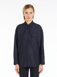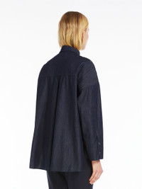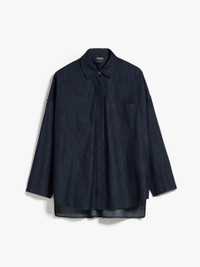 DETAILS Shirt in pure cotton denim, featuring a slightly large volume with long, dropped sleeves, central reverse pleat on the back and rounded slits on the hem. Finished with a classic collar, patch breast pocket and small buttons on the cuffs. Asymmetrical hemline, longer on the back, and front closure with concealed buttons. COMPOSITION AND CARE 100% cotton. Machine wash cold delicate cycle; do not bleach; do not tumble dry; line drying in the shade; cool iron; professionally dry clean perchloroethylene - mild process.; wash the garment while it is fastened.; turn the articles inside out before washing.; take care when wearing light-coloured clothes or accessories because, with the heat of the body, the indigo fabric , may fade and stain. be careful while sitting on light coloured surfaces, especially if wet. wash garments separately and always turned inside out. hang the garment turned inside out by avoiding to expose it to direct sunlight. avoid removing isolated stains.; contains non-textile parts of animal origin. Distributed by Max Mara S.r.l., registered office in Reggio Emilia (Italy), Via Giulia Maramotti 4, 42124 (IT)