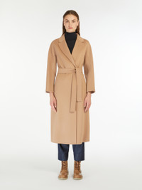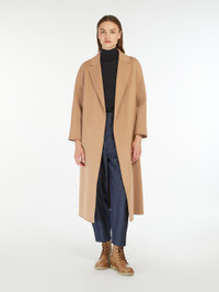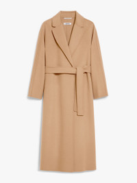 DETAILS Straight-fit midi coat featuring a slightly flared cut at the hem. Coat in hand-sewn double-faced pure wool broadcloth Small lapel collar Long kimono sleeves Matching belt-adorned wraparound fastening In-seam side pockets Unlined model COMPOSITION AND CARE Fabric 100% virgin wool; - except joining thread. Do not wash; do not bleach; do not tumble dry; cool iron; professionally dry clean perchloroethylene - mild process; do not wet clean. Distributed by Max Mara S.r.l., registered office in Reggio Emilia (Italy), Via Giulia Maramotti 4, 42124 (IT)