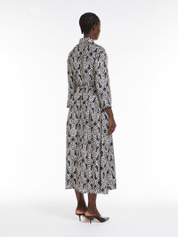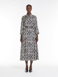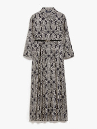 DETAILS Midi shirt dress in luxurious pure silk twill, featuring an all-over printed geometric circle pattern and a full, pleated skirt. The feminine silhouette with a high waist seam and darts is accentuated by a matching, leather and fabric elasticated belt at the waist. The style features a classic shirt collar, long sleeves and inset side pockets. Concealed button fastening at the front. COMPOSITION AND CARE 100% silk. Do not wash; do not bleach; do not tumble dry; cool iron; professionally dry clean perchloroethylene - mild process; do not wet clean.; wash the garment while it is fastened.; turn the articles inside out before washing.; remove the belt before washing.; contains non-textile parts of animal origin. Distributed by Max Mara S.r.l., registered office in Reggio Emilia (Italy), Via Giulia Maramotti 4, 42124 (IT)