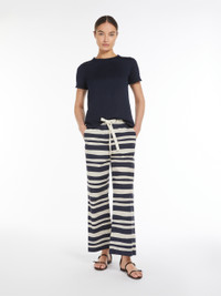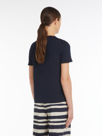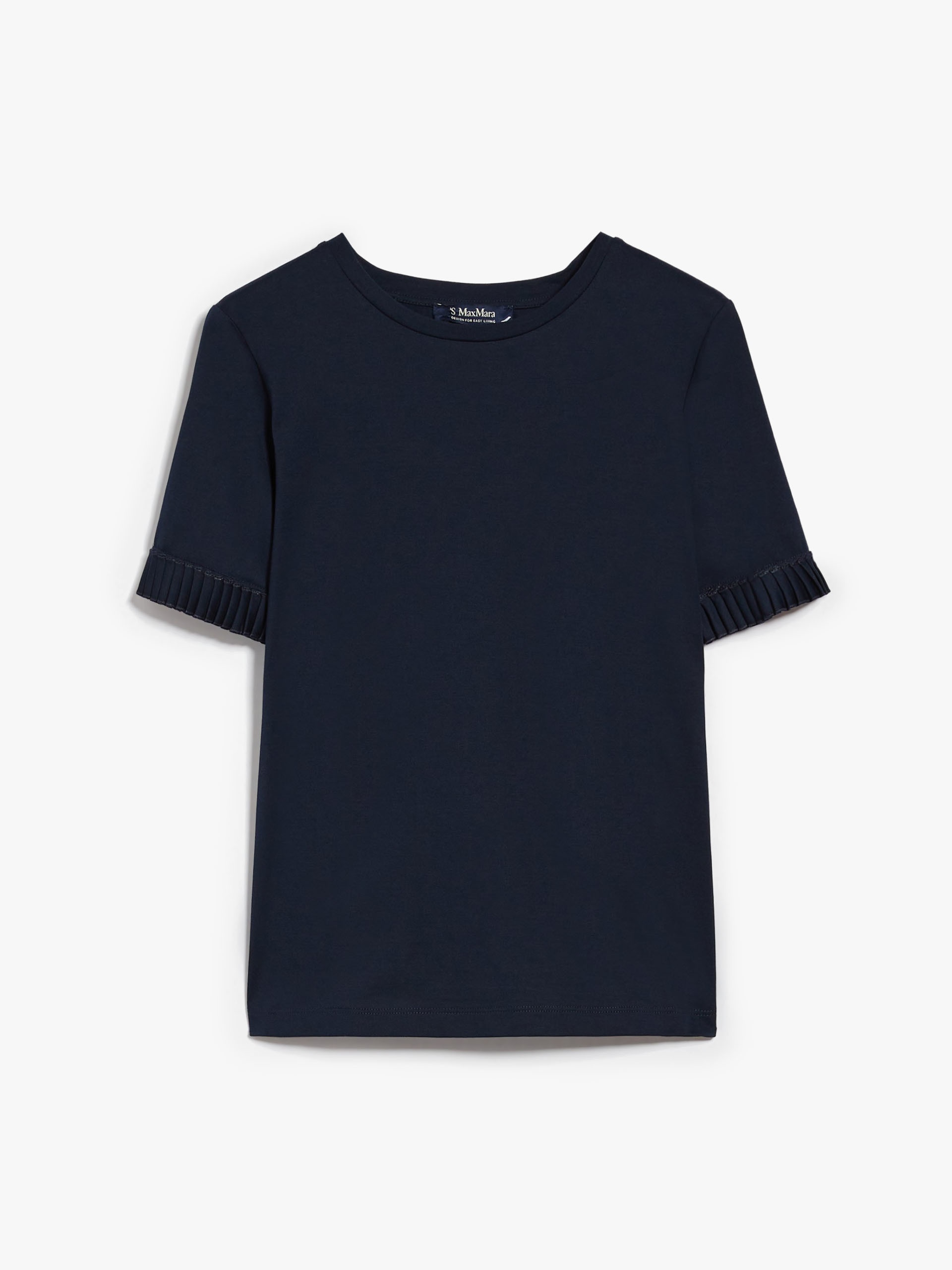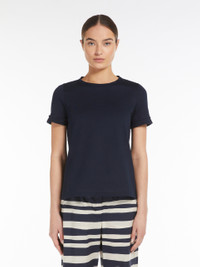 DETAILS Short-sleeved crew-neck T-shirt in soft pure cotton jersey fabric. The feminine-fit model boasts small ruche detail at the sleeve hems. COMPOSITION AND CARE 100% cotton. Machine wash cold delicate cycle; do not bleach; do not tumble dry; flat drying in the shade; cool iron; professionally dry clean perchloroethylene - mild process; professional wet cleaning - very mild process.; iron with a cloth between.; using neutral detergent. Distributed by Max Mara S.r.l., registered office in Reggio Emilia (Italy), Via Giulia Maramotti 4, 42124 (IT)