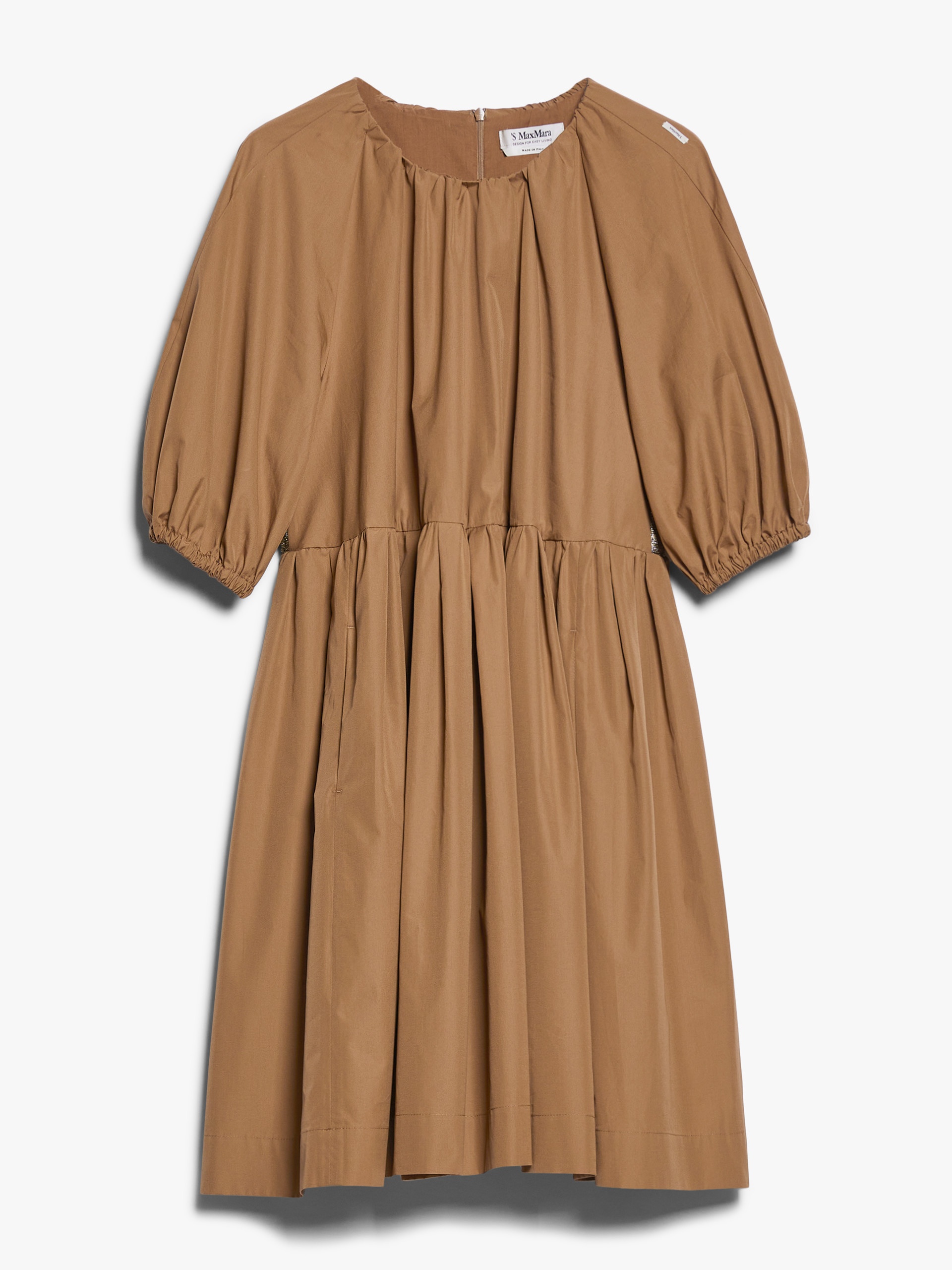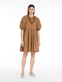 DETAILS Short dress in soft pure cotton poplin, featuring short balloon raglan sleeves with an elasticated cuff, side inset pockets and gathers at the crew neck and waist. The flared silhouette is embellished at the back waist with a lurex jacquard intarsia motif. Invisible zip fastening on the back. COMPOSITION AND CARE Fabric 100% cotton; lining 100% cotton. Do not wash; do not bleach; do not tumble dry; cool iron; professionally dry clean perchloroethylene - mild process; do not wet clean. Distributed by Max Mara S.r.l., registered office in Reggio Emilia (Italy), Via Giulia Maramotti 4, 42124 (IT)