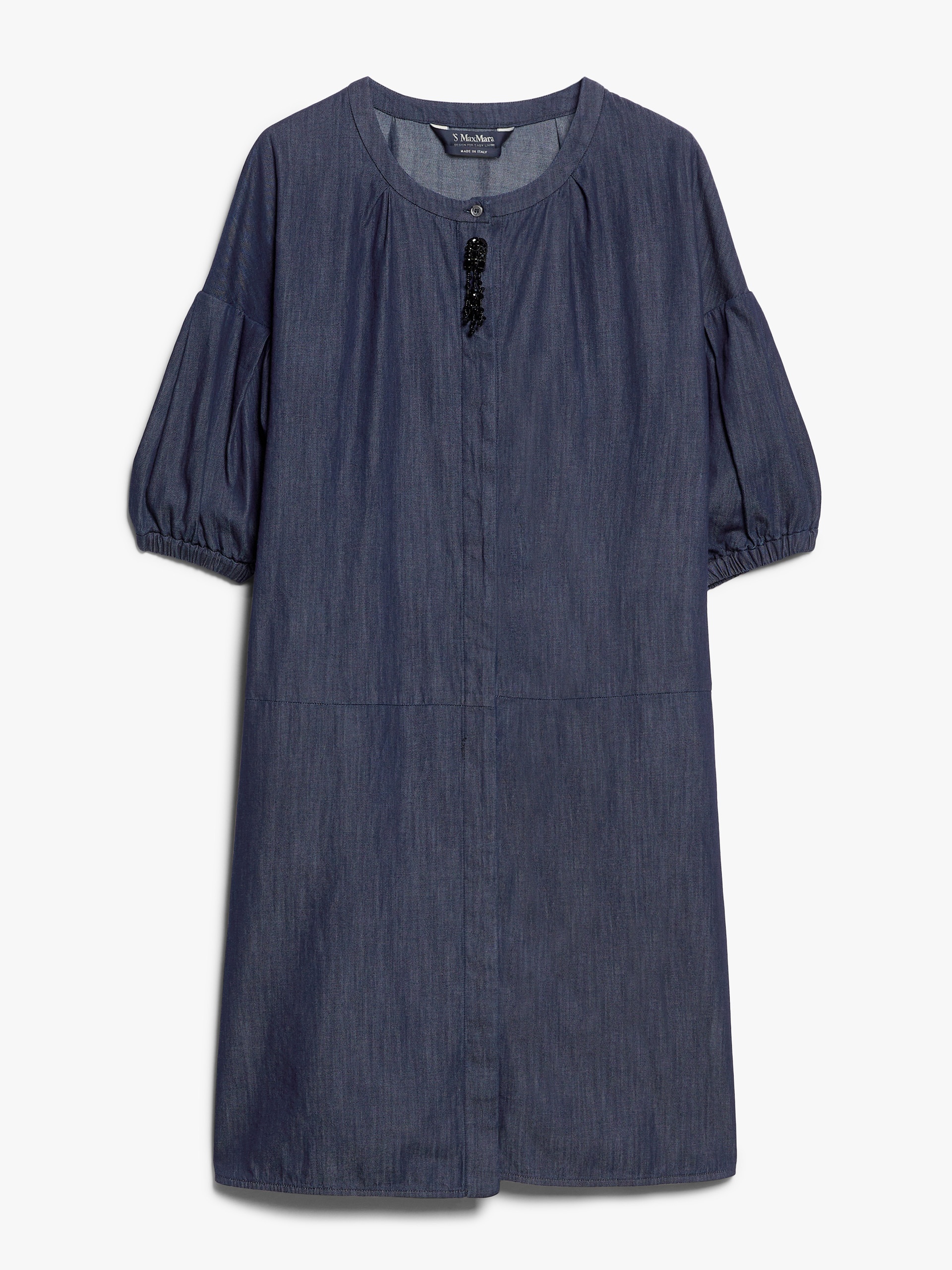 DETAILS Short dress in lightweight garment-washed pure cotton denim, featuring short balloon sleeves with dropped shoulders and elasticated cuffs. Finished with side inset pockets and a concealed front opening with buttons, embellished with a removable embroidered badge on the front. COMPOSITION AND CARE Fabric 100% cotton; - exclusive of decoration. Machine wash cold delicate cycle; do not bleach; do not tumble dry; line drying in the shade; cool iron; professionally dry clean perchloroethylene - mild process.; wash the garment while it is fastened.; remove the decorations before washing.; take care when wearing light-coloured clothes or accessories because, with the heat of the body, the indigo fabric , may fade and stain. be careful while sitting on light coloured surfaces, especially if wet. wash garments separately and always turned inside out. hang the garment turned inside out by avoiding to expose it to direct sunlight. avoid removing isolated stains.; contains non-textile parts of animal origin. Distributed by Max Mara S.r.l., registered office in Reggio Emilia (Italy), Via Giulia Maramotti 4, 42124 (IT)