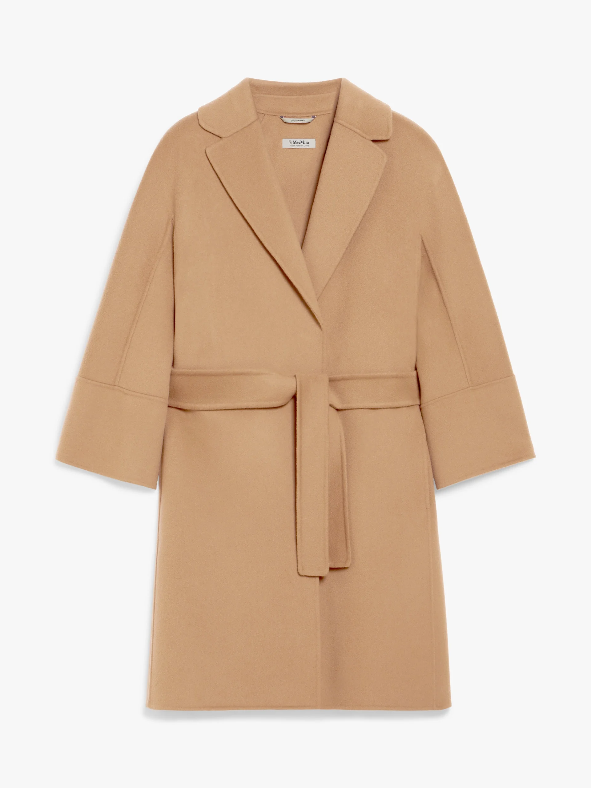 DETAILS Cocoon-fit short coat featuring a darted rear waist. Coat in hand-sewn double-faced pure wool broadcloth The comfort fit tapers slightly at the hem Small lapel collar Kimono sleeves on the front and raglan sleeves at the back Matching belt In-seam side pockets Unlined model COMPOSITION AND CARE Fabric 100% virgin wool; - except joining thread. Do not wash; do not bleach; do not tumble dry; cool iron; professionally dry clean perchloroethylene - mild process; do not wet clean. Distributed by Max Mara S.r.l., registered office in Reggio Emilia (Italy), Via Giulia Maramotti 4, 42124 (IT)