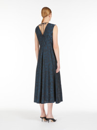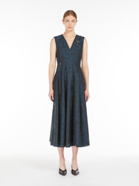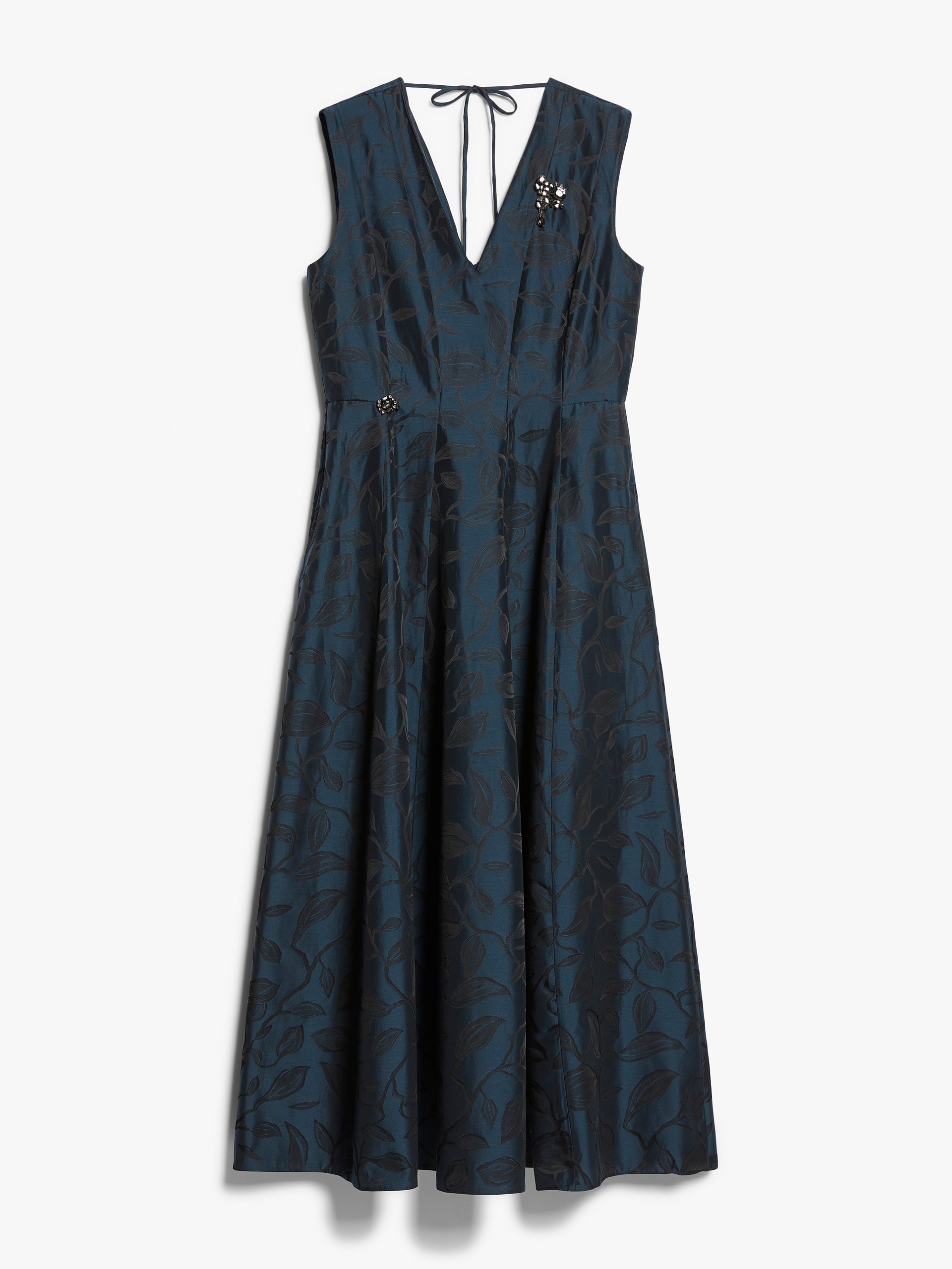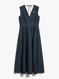 DETAILS Sleeveless midi dress made of luxurious cotton fabric with an all-over jacquard design. Featuring a silhouette with a fitted bodice and slightly flared skirt at the hem with side inset pockets. Style with a V neck, front and back, embellished with removable embroidered bezel details. Closure with ties to be fastened at the back of the neck and a concealed zip. COMPOSITION AND CARE Fabric 61% polyester, 39% cotton; lining 61% polyester, 39% cotton. Hand wash cold; do not bleach; do not tumble dry; line drying in the shade; cool iron; professionally dry clean perchloroethylene - mild process; do not wet clean.; remove the decorations before washing. Distributed by Max Mara S.r.l., registered office in Reggio Emilia (Italy), Via Giulia Maramotti 4, 42124 (IT)