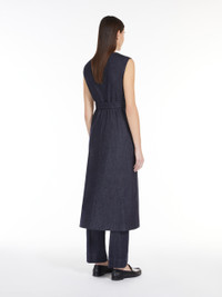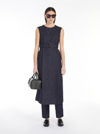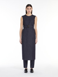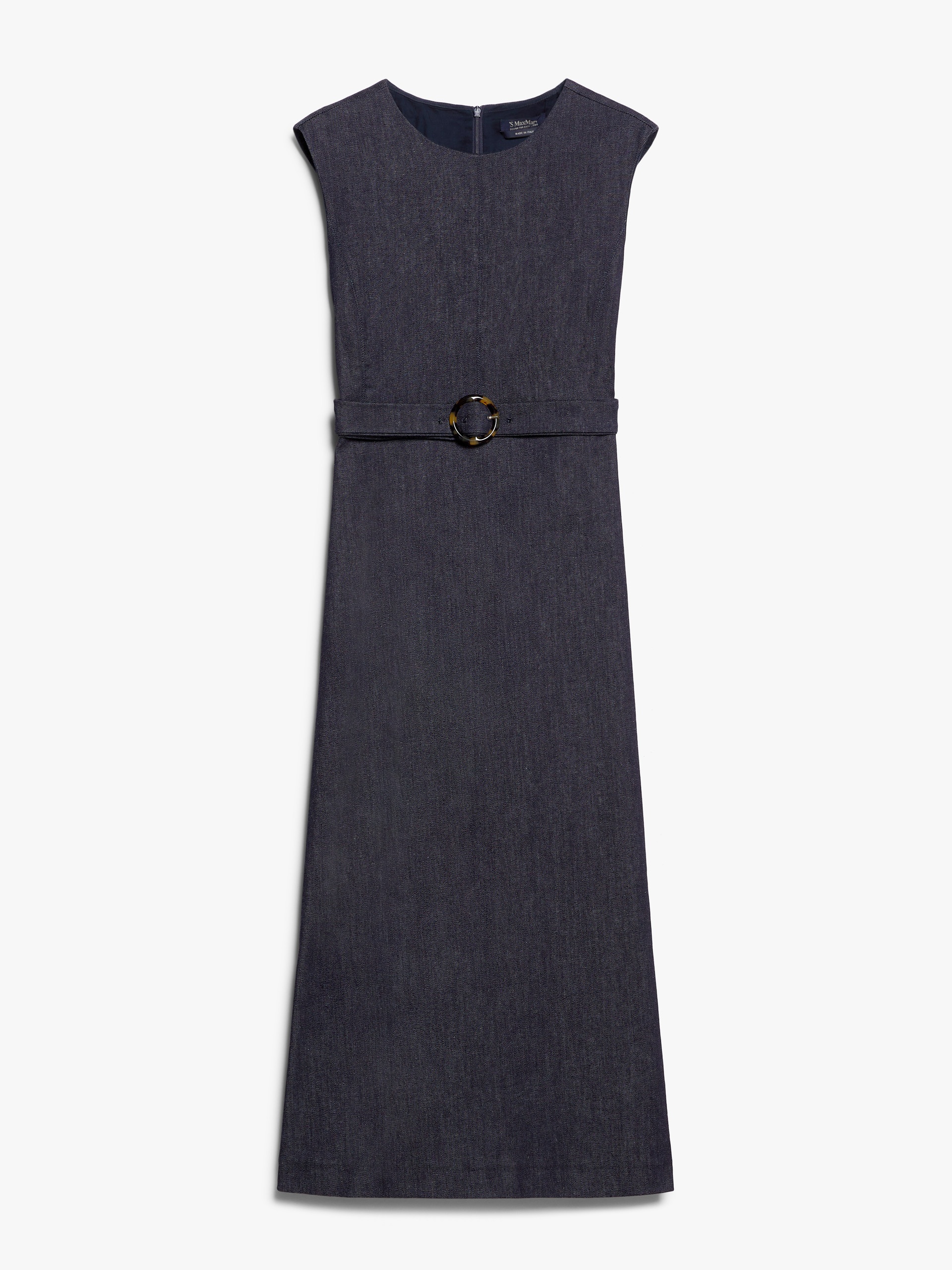 DETAILS Sleeveless garment-dyed stretch cotton denim sheath dress. This style comes with a round-neck bodice with a vertical dart in the centre and horizontal dart at the waist. The matching belt highlights the figure. Concealed zip fastening at the back. COMPOSITION AND CARE Fabric 90% cotton, 8% elastomultiester, 2% elastane; lining 100% cotton. Machine wash cold delicate cycle; do not bleach; do not tumble dry; line drying in the shade; cool iron; professionally dry clean perchloroethylene - mild process.; remove the buckle before washing.; take care when wearing light-coloured clothes or accessories because, with the heat of the body, the indigo fabric , may fade and stain. be careful while sitting on light coloured surfaces, especially if wet. wash garments separately and always turned inside out. hang the garment turned inside out by avoiding to expose it to direct sunlight. avoid removing isolated stains. Distributed by Max Mara S.r.l., registered office in Reggio Emilia (Italy), Via Giulia Maramotti 4, 42124 (IT)